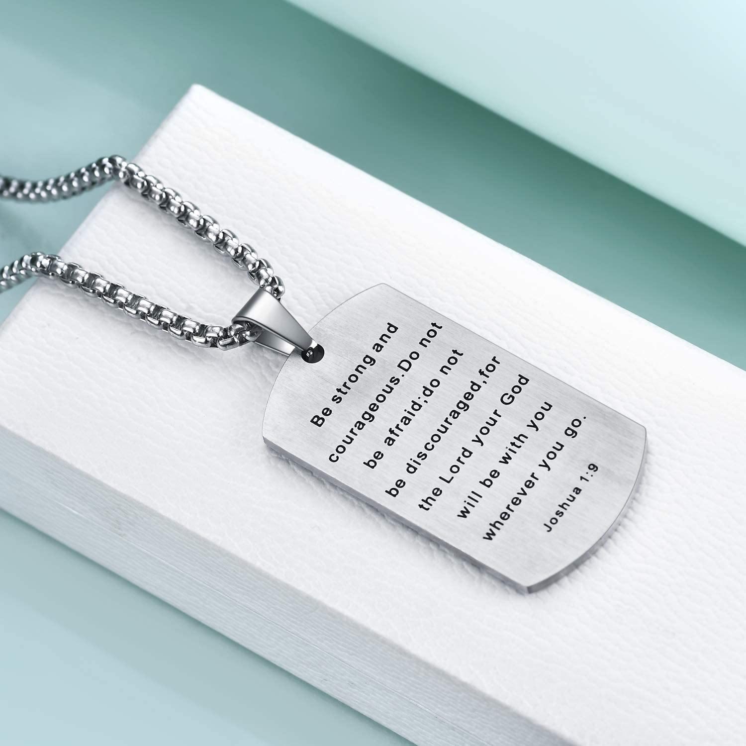 A stainless steel pendant, featuring a bold black cross on one side and the inspiring scripture from Joshua 1:9 “Be strong and courageous. Do not be afraid; do not be discouraged, for the Lord your God will be with you whether you go.” on the reverse, stands as a sturdy testament to faith and courage. -