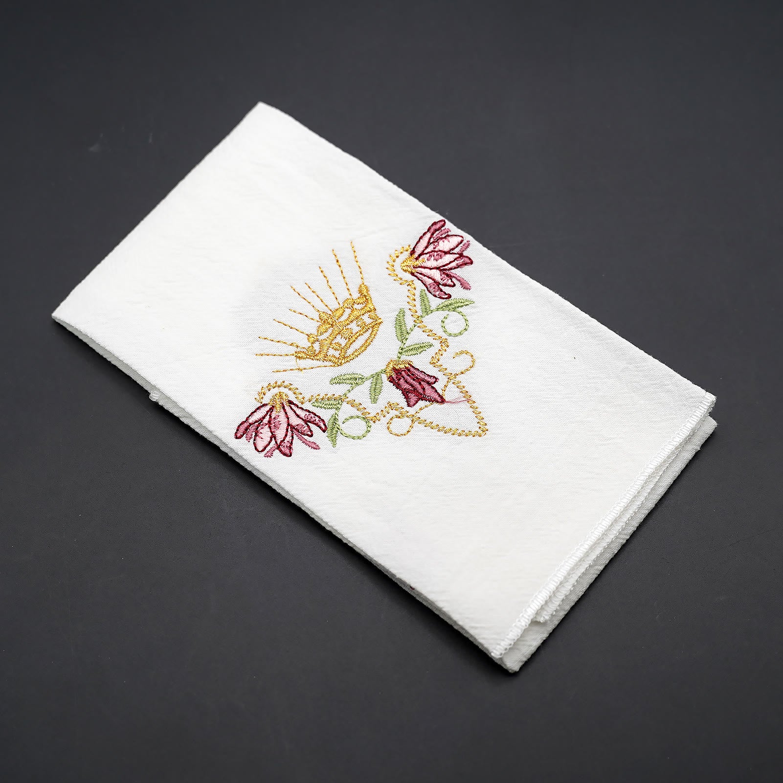 Elevate your spiritual practice with these exquisitely embroidered handkerchiefs, each featuring sacred symbols like crosses, crowns, and floral motifs — a tangible expression of faith and reverence. -