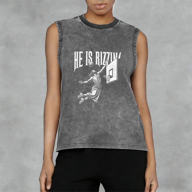 Introducing the "He Is Rizzin'" Unisex Washed Tank Top, a playful and energetic piece that speaks volumes about your faith and personality. The design reimagines the Easter proclamation "He is risen" with a clever twist "He is rizzin'", pairing it with a fun illustration of Jesus dunking a basketball — a lighthearted nod to Christ’s victory over death, blending modern slang with the core truth of the resurrection.
