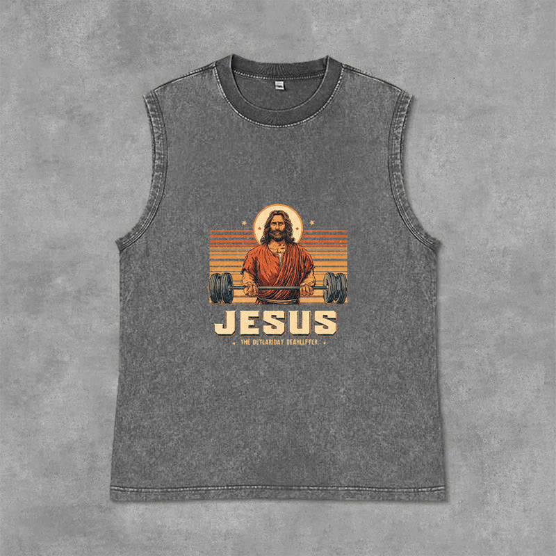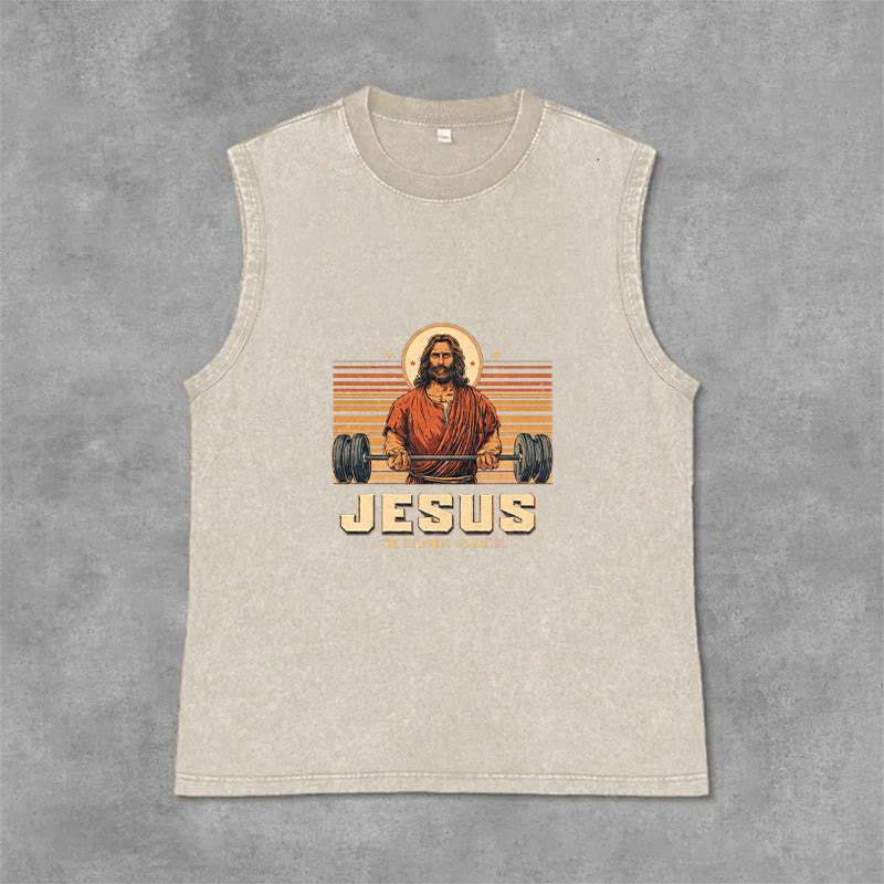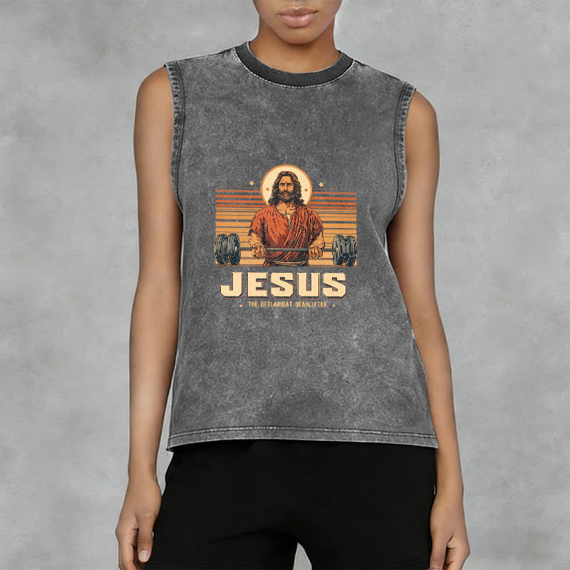 Introducing the "The Ultimate Deadlifter" Unisex Washed Tank Top, a bold and playful piece that speaks volumes about your faith and strength. The design features a retro-style illustration of Jesus lifting a barbell, paired with the phrase "THE ULTIMATE SAVIOR" — a lighthearted fusion of fitness and faith, symbolizing Christ’s power to lift us up from every burden and challenge.
