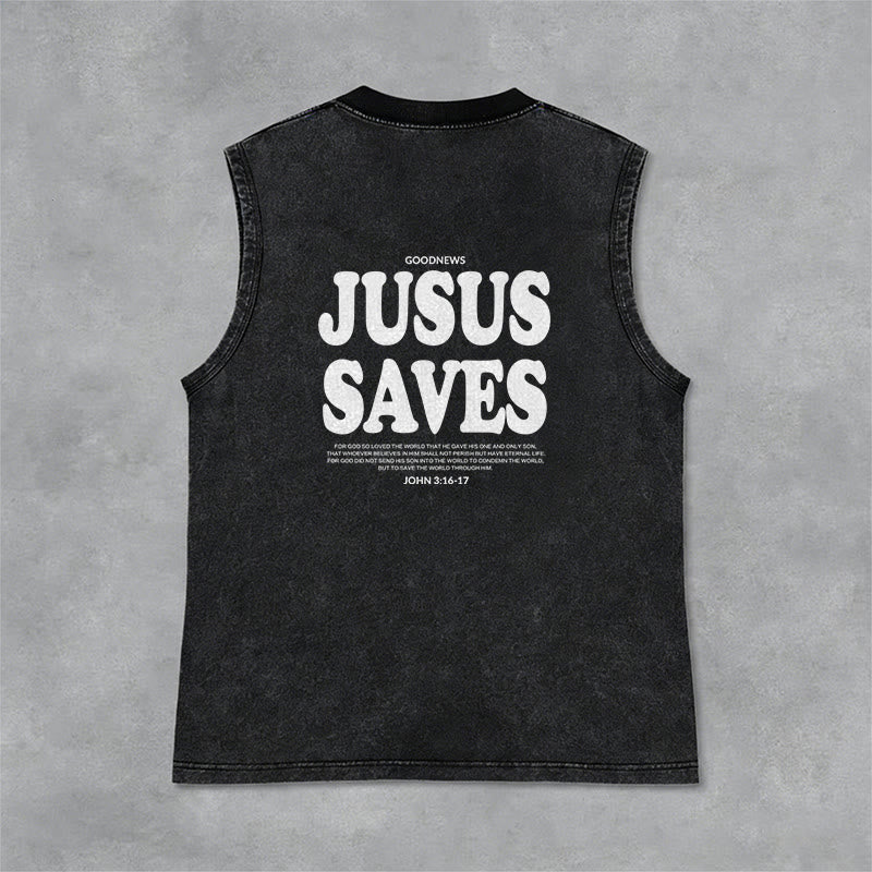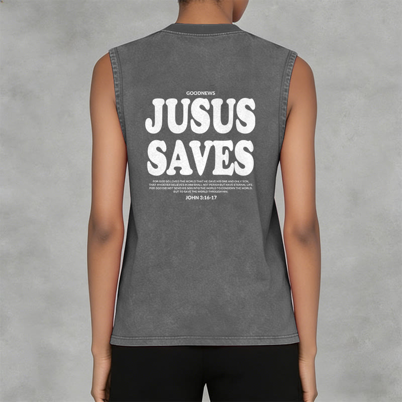 Introducing the "Jesus Saves John 3:16" Unisex Washed Tank Top, a bold and hopeful piece that speaks volumes about your faith. The design features large, retro-style lettering spelling JESUS SAVES on the back, paired with the iconic scripture from John 3:16-17 and a smaller front accent of the same phrase — a timeless proclamation of the gospel’s core truth, rooted in the biblical promise that God’s love offers eternal salvation to all who believe. This tank top serves as a wearable witness to share the good news of redemption with everyone you encounter.