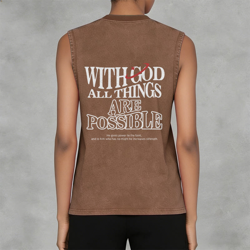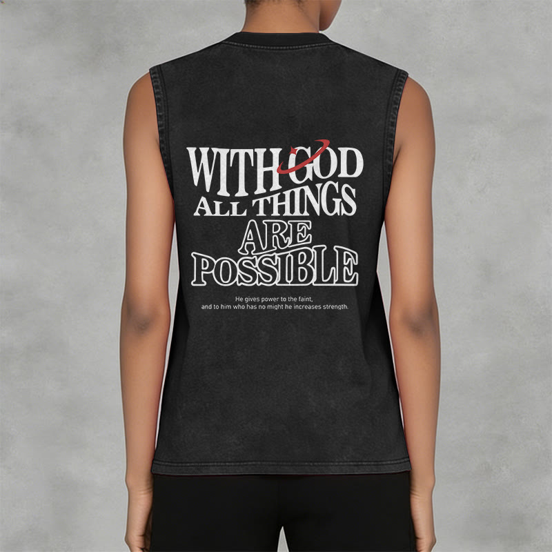 Introducing the "With God All Things Are Possible" Unisex Washed Tank Top, an uplifting and encouraging piece that speaks volumes about your faith. The design features bold, vintage-style lettering spelling WITH GOD ALL THINGS ARE POSSIBLE, paired with a subtle accent and a verse reminding us that God gives strength to the weary — a timeless proclamation rooted in the biblical truth that no challenge is too great for divine power.