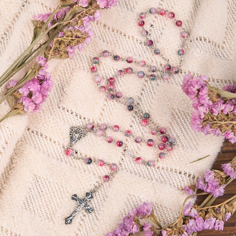 Our Lady of Rosary & Crucifix of 6mm Round Multi-pink Agate Alloy Chain Rosary