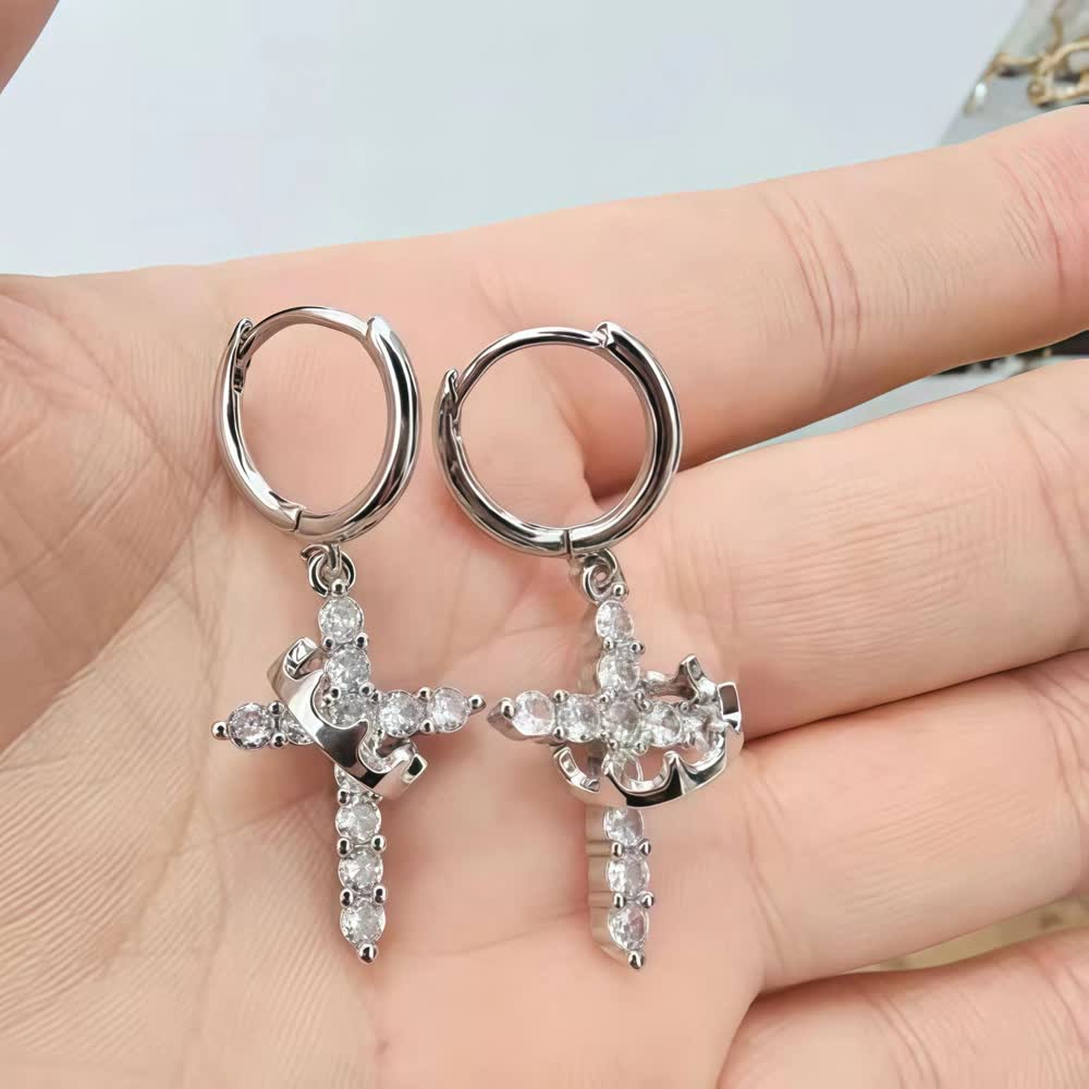 The necklace features a sleek two-tone cross crowned with delicate metalwork, while matching earrings echo its elegant silhouette—sacred symbolism reimagined in modern lightness. -