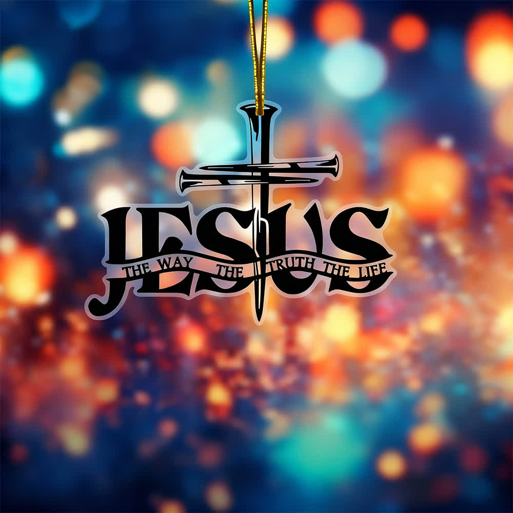 This car ornament features a distinctive nail-shaped cross, integrated with the bold “JESUS” lettering and the scripture “THE WAY THE TRUTH THE LIFE”.