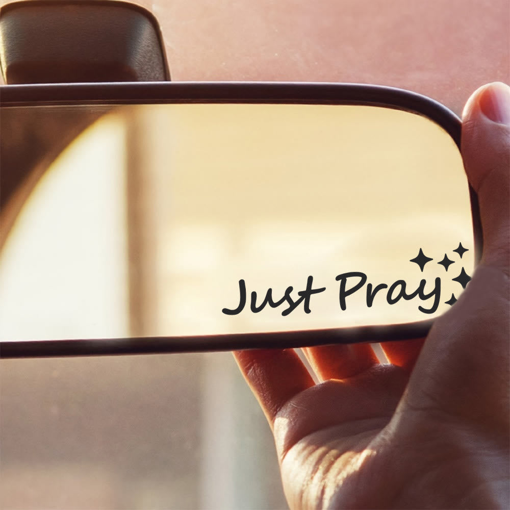 Featuring a sleek "Just Pray" script with star accents in varied finishes — including the laser style — radiating the peace of intentional prayer and the promise of mindful connection — inviting quiet moments of devotion every time you take the wheel.