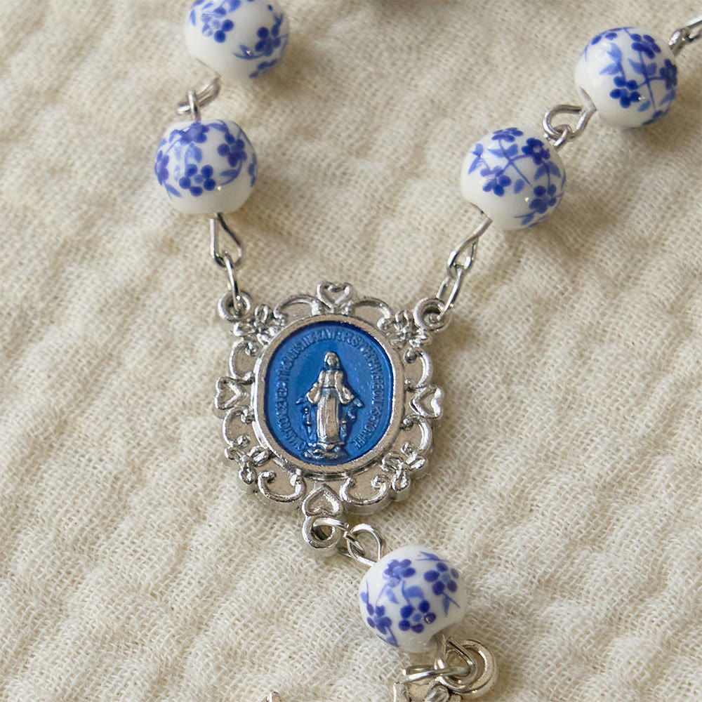 This auto rosary (crafted for car display) embodies the serene devotion to Our Lady—made with blue-and-white ceramic beads, a silver-toned Our Lady medallion with blue enamel detailing, and an ornate silver crucifix. Designed to hang from car rearview mirrors, it merges classic blue-and-white porcelain aesthetics with sacred Marian symbolism, turning every drive into a grace-filled act of devotion. -