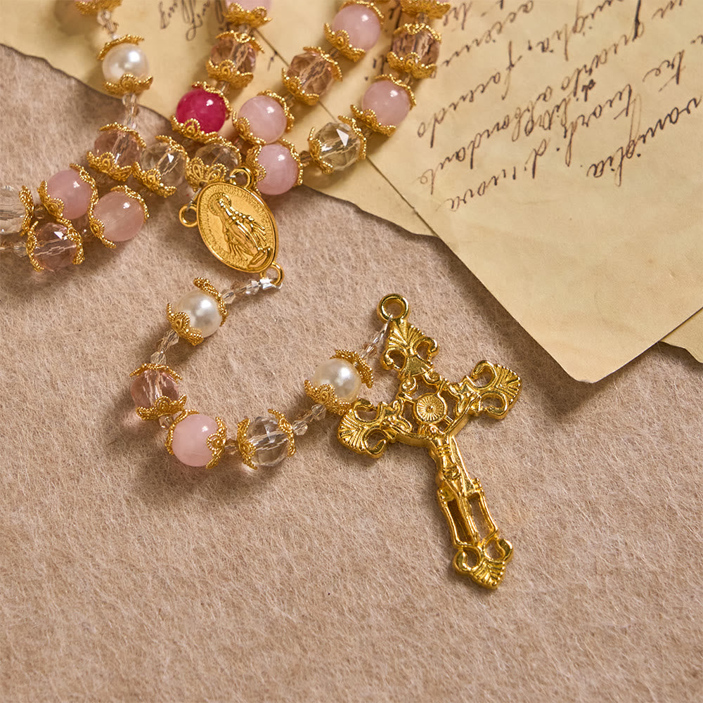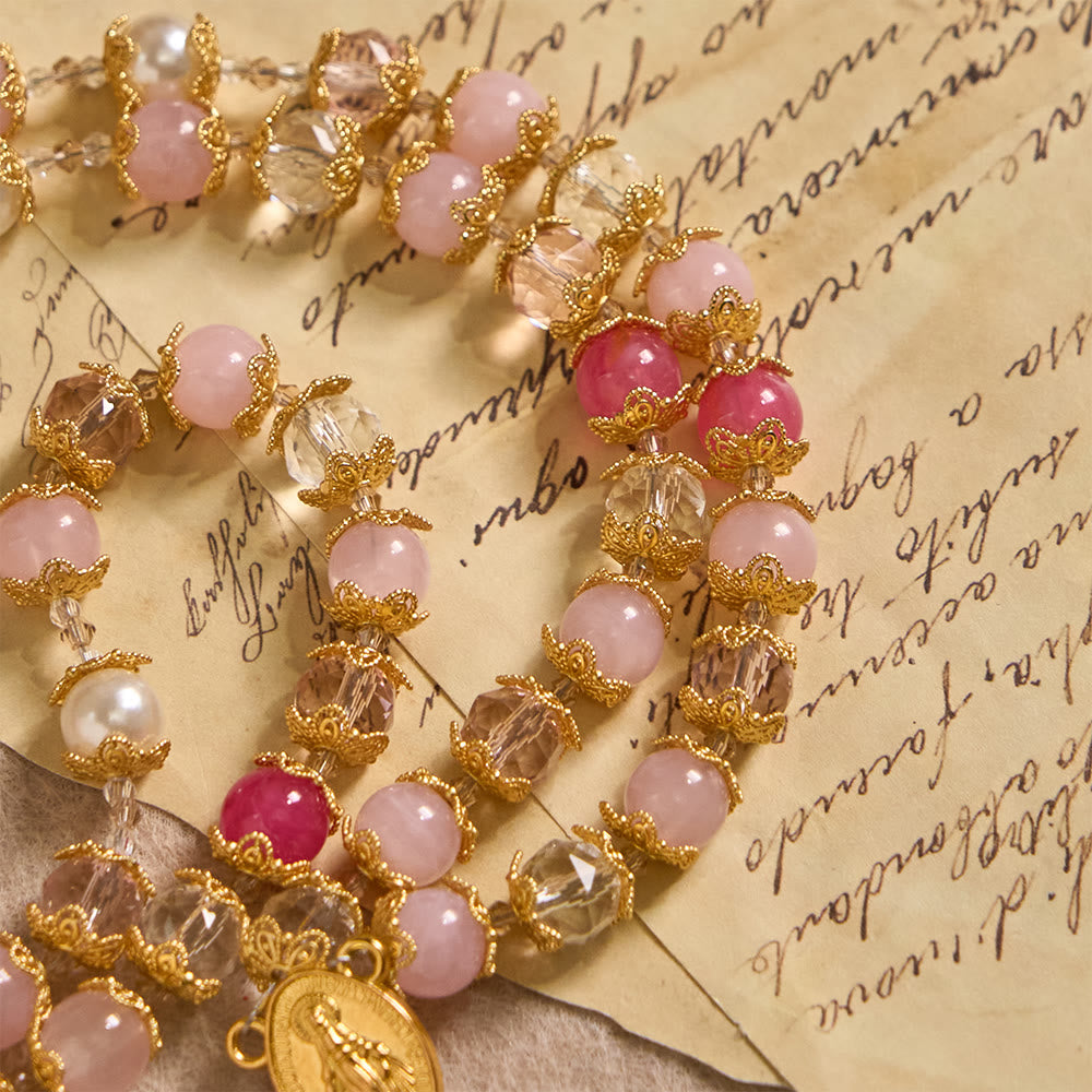 The pink glass beads symbolize the purity of faith and the warmth of divine love, while the crystal accents add a touch of luminous reverence. The golden Our Lady medallion wraps every prayer in maternal intercession, and the ornate crucifix anchors each prayer in sacrificial love, turning each bead into a step closer to divine mercy. -
