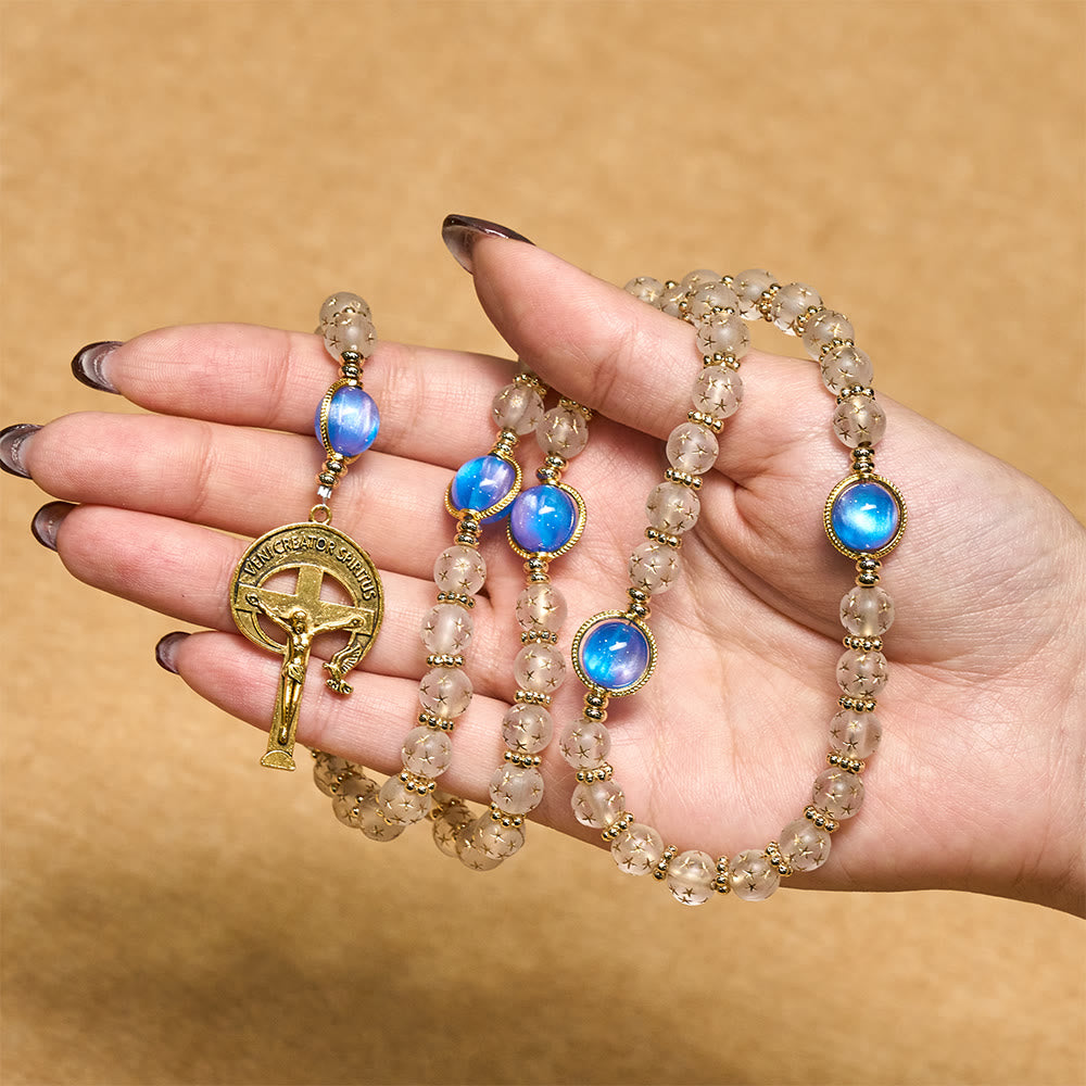 Meticulously made with smooth star beads and iridescent sea blue accents, the rosary balances delicate texture with meaningful detail. The crucifix and medal add devotion, turning it into a steady touchpoint for faith. -