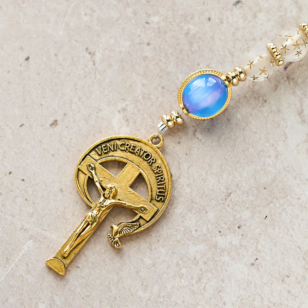 This rosary merges sacred symbols (crucifix, Our Lady medal) with white star beads and sea blue cat eye accents — pairing spiritual purpose with soft, luminous charm to create a tender companion for prayer. -