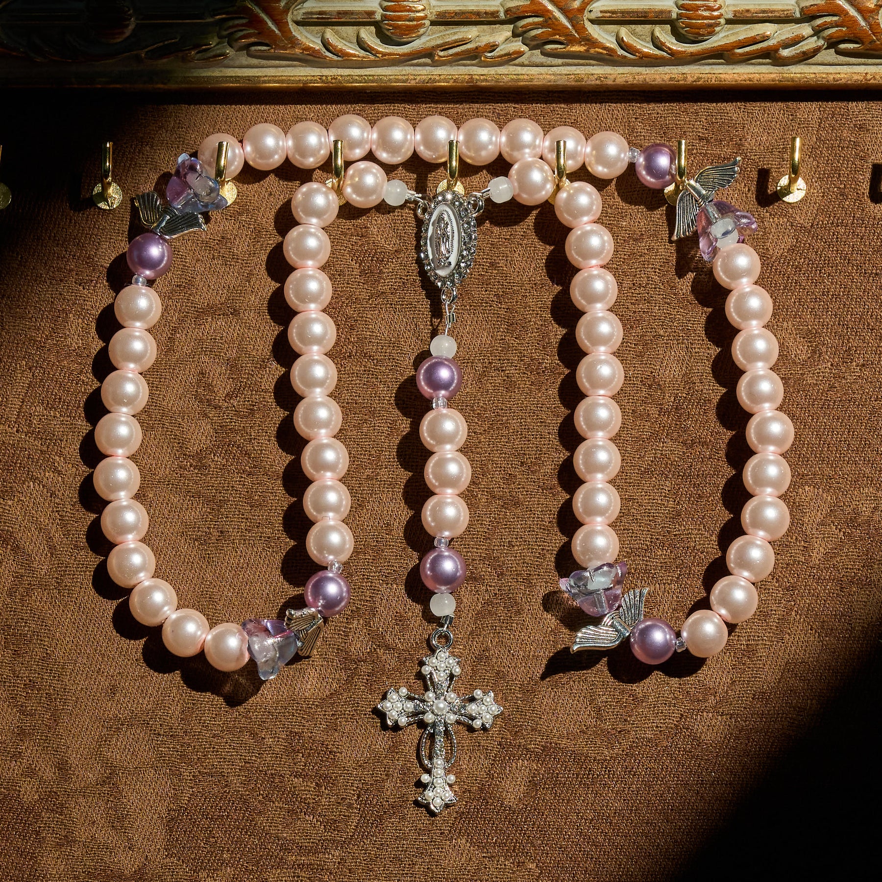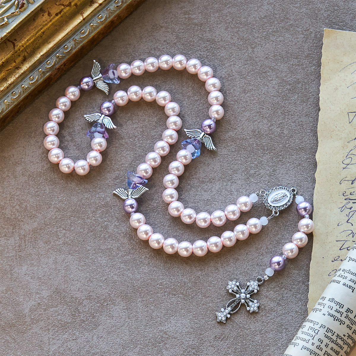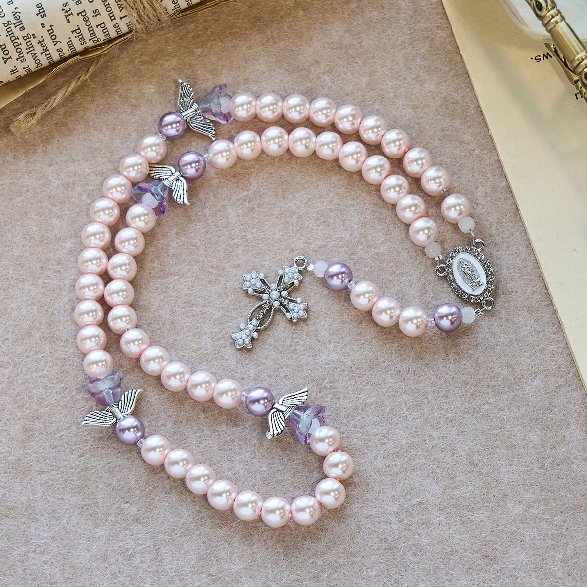 The soft lavender hues reflect divine grace and spiritual healing, offering calmness and assurance. As you pray, the rosary invites moments of stillness, where the guardian angel’s presence brings guidance and peace, drawing you closer to Christ’s love.