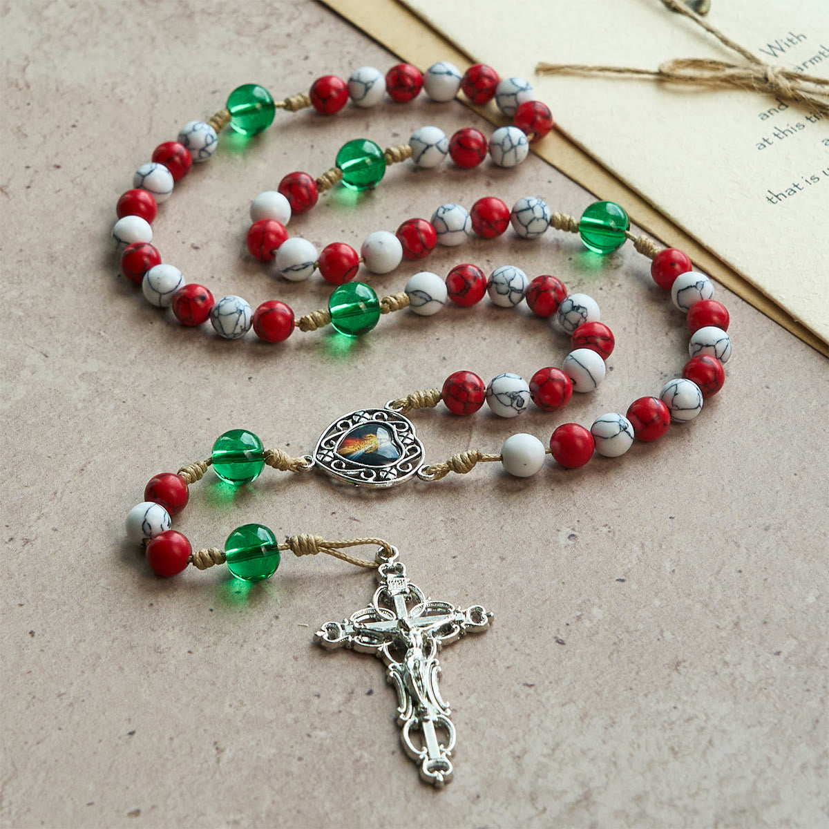This Christmas rosary strings bright red, marble-white, and evergreen beads around a baroque crucifix and a heart-framed center—one side Divine Mercy, the other Our Lady—uniting festive cheer with the mystery of Christ’s birth.