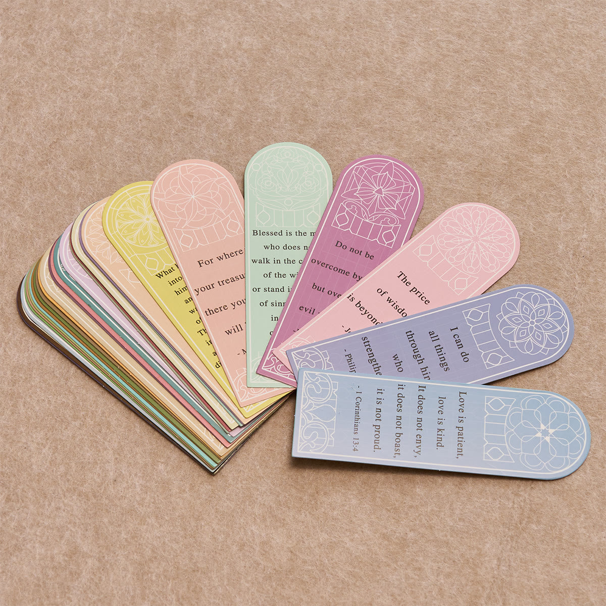 A collection of thirty verses from across Scripture—on love, mercy, courage, hope, and trust—shaped like stained-glass windows. Rotate one each day, slip them into your Bible or journal, or share with friends to keep God’s Word always at hand.