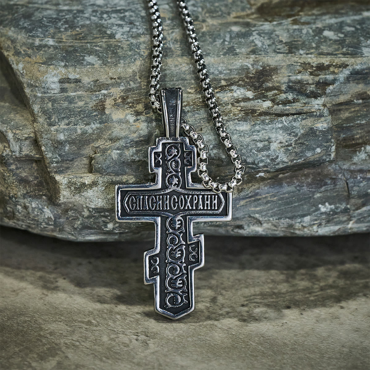 Crafted from durable titanium steel, this vintage Orthodox cross necklace bears intricate engravings and a timeless silver-gray finish—built to resist rust, fading, and wear while carrying the weight of sacred tradition. -