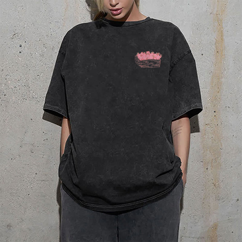 This black, vintage - washed T - shirt is a stylish blend of faith and fashion. The front features a small, subtle pink graphic of a crate filled with strawberries on the left side. The back is where it truly shines. In eye - catching pink lettering, it proclaims “the fruit of THE SPIRIT”. Below, a crate brimming with strawberries is depicted, symbolizing the spiritual fruits listed beneath: Love, Joy, Peace, Patience, Kindness, Goodness, Faithfulness, Gentleness, and Self - Control.