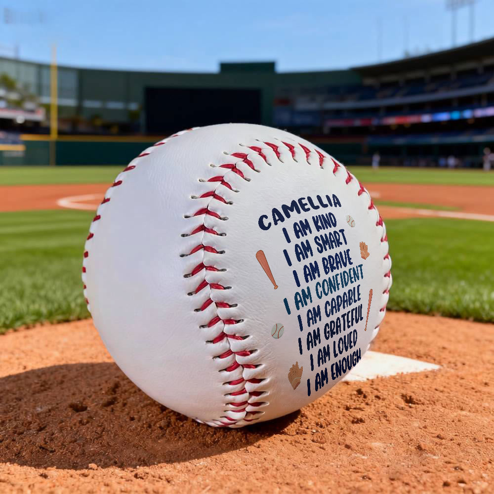 Crafted with durable leather and bold red stitching, this baseball bears personalized affirmations like “I am loved, enough” — echoing the truth of being valued in God’s sight.