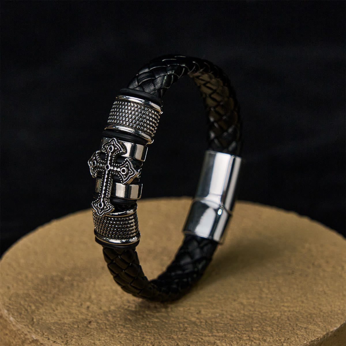 Luxe leather braids embrace skin like divine assurance, centered by a cross of breathtaking craftsmanship—each curve a psalm, every facet a silent doxology. -