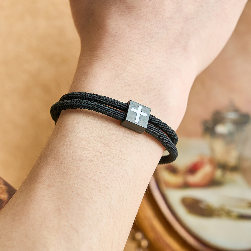 This adjustable Milan-style rope bracelet centers a polished cross bead as a simple, wearable reminder of God’s presence and blessing. The sleek square charm sits on two parallel cords with a sliding closure for an easy, custom fit.