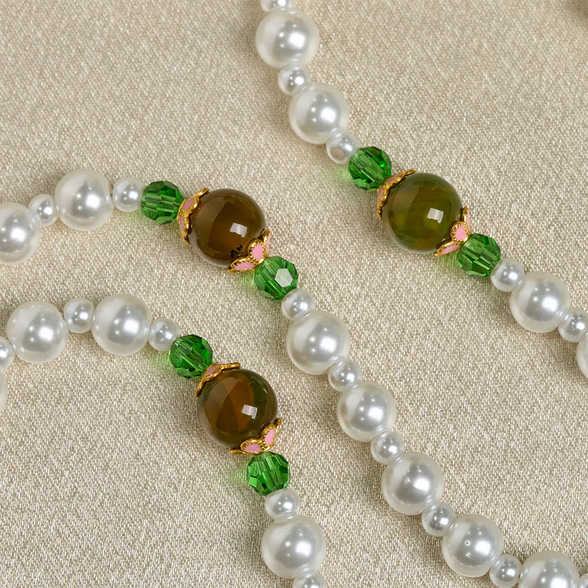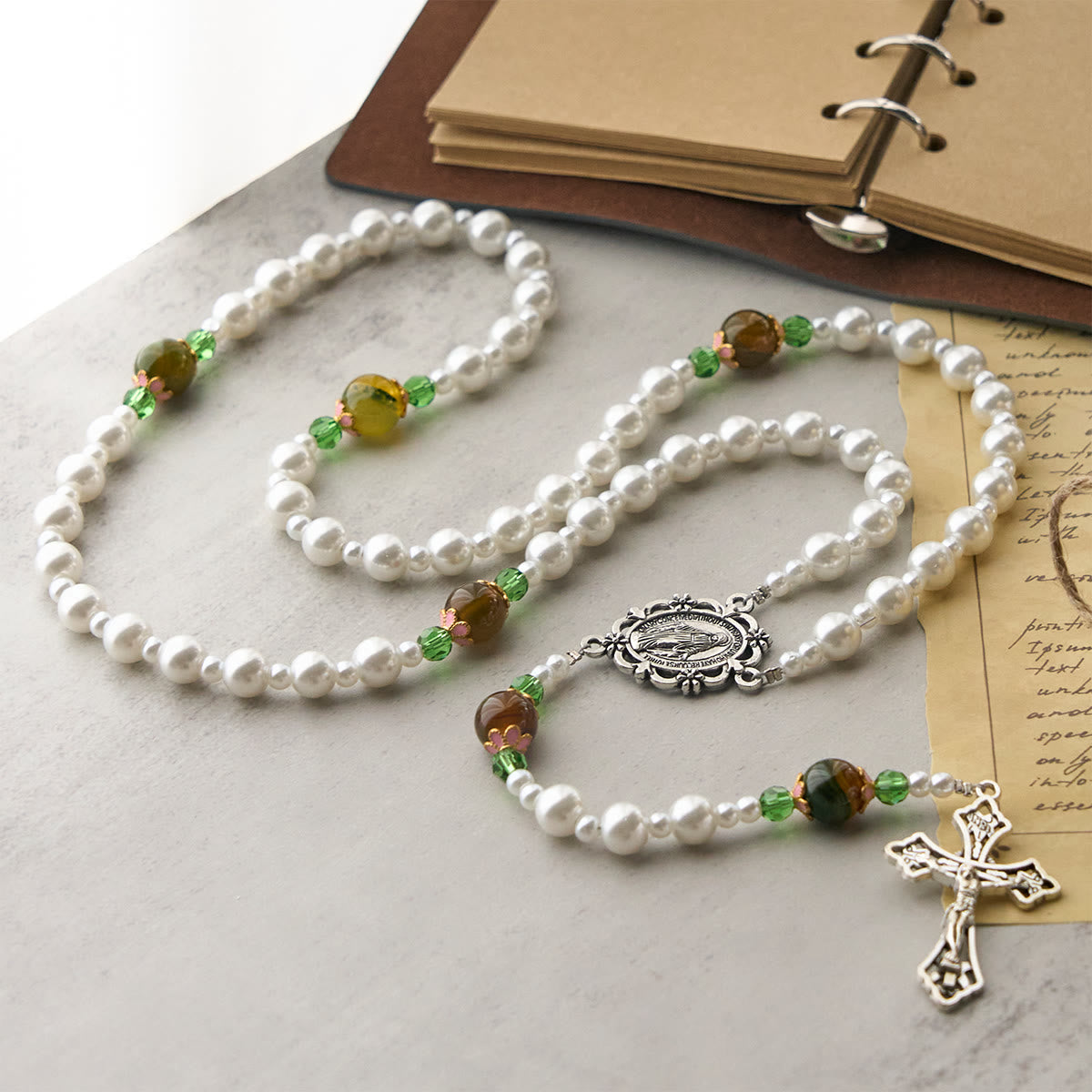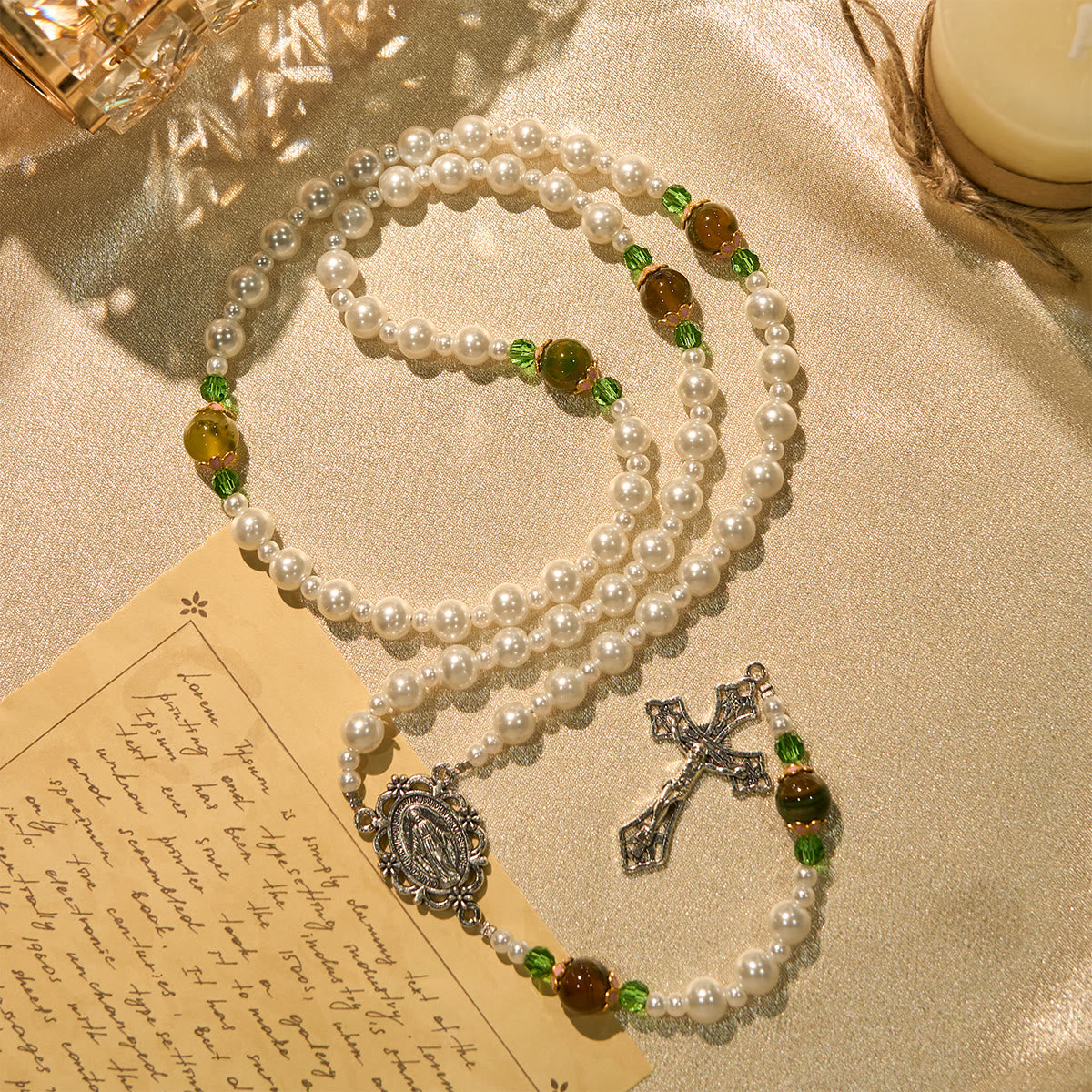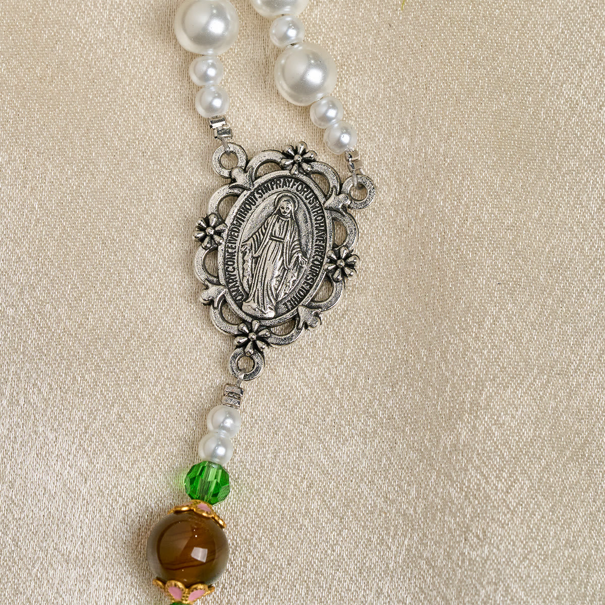 This elegant rosary features a harmonious blend of soft white beads, delicate pink beads, and refreshing green accents, creating a floral-inspired design that reflects purity, hope, and renewal. -
