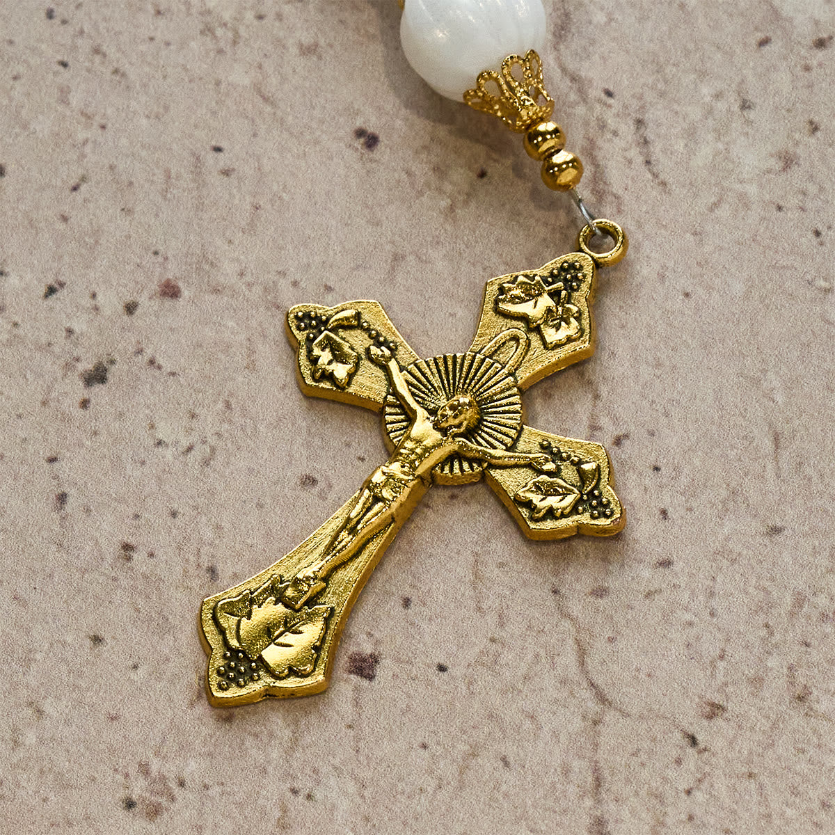 The detailed golden crucifix proclaims Christ’s sacrifice, anchoring your devotion and deepening reflection on salvation with every bead.