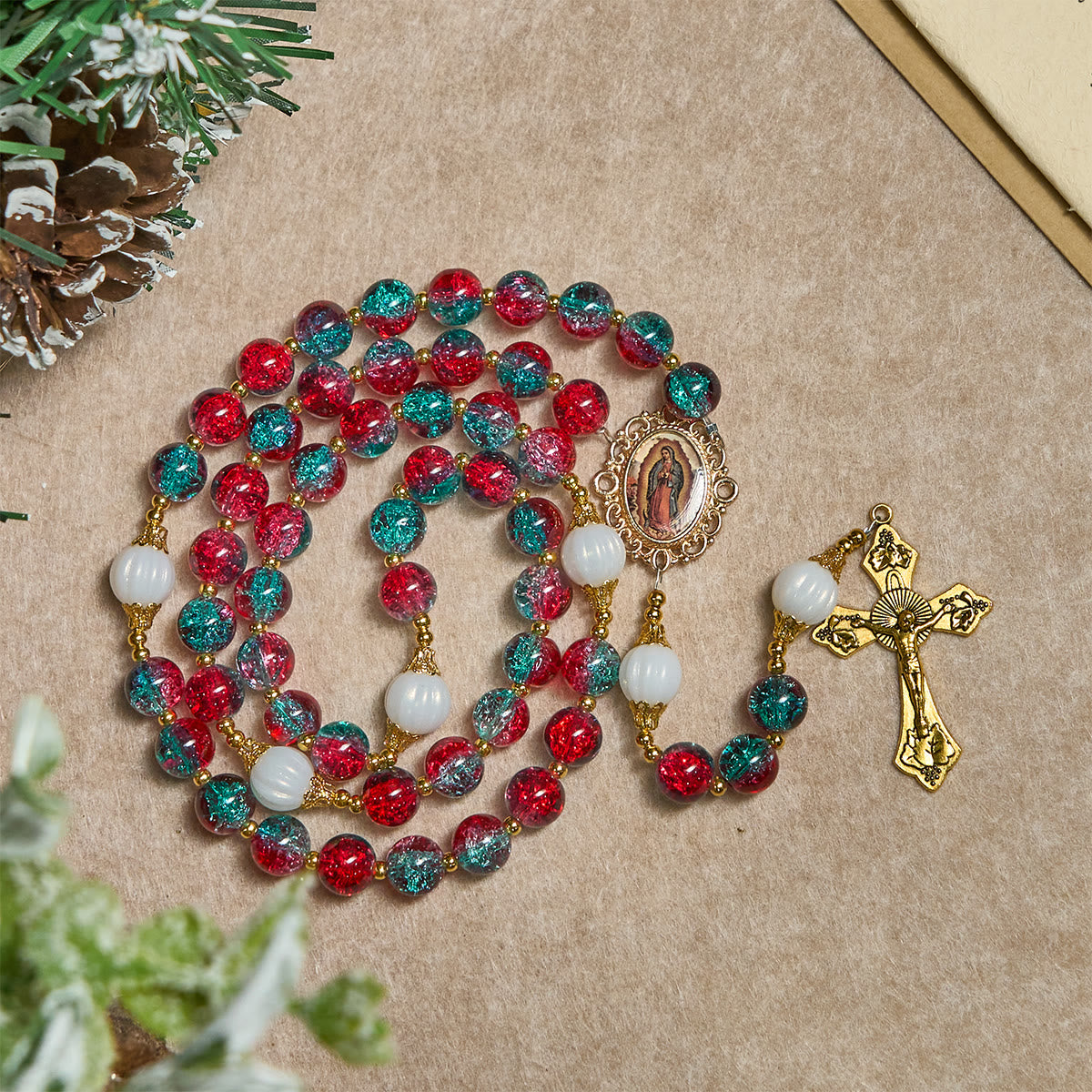 Handcrafted with Christmas red-blue glass beads, this rosary features an Our Lady of Guadalupe medal and a golden cross—blending holiday vibrancy with spiritual reverence in every decade.