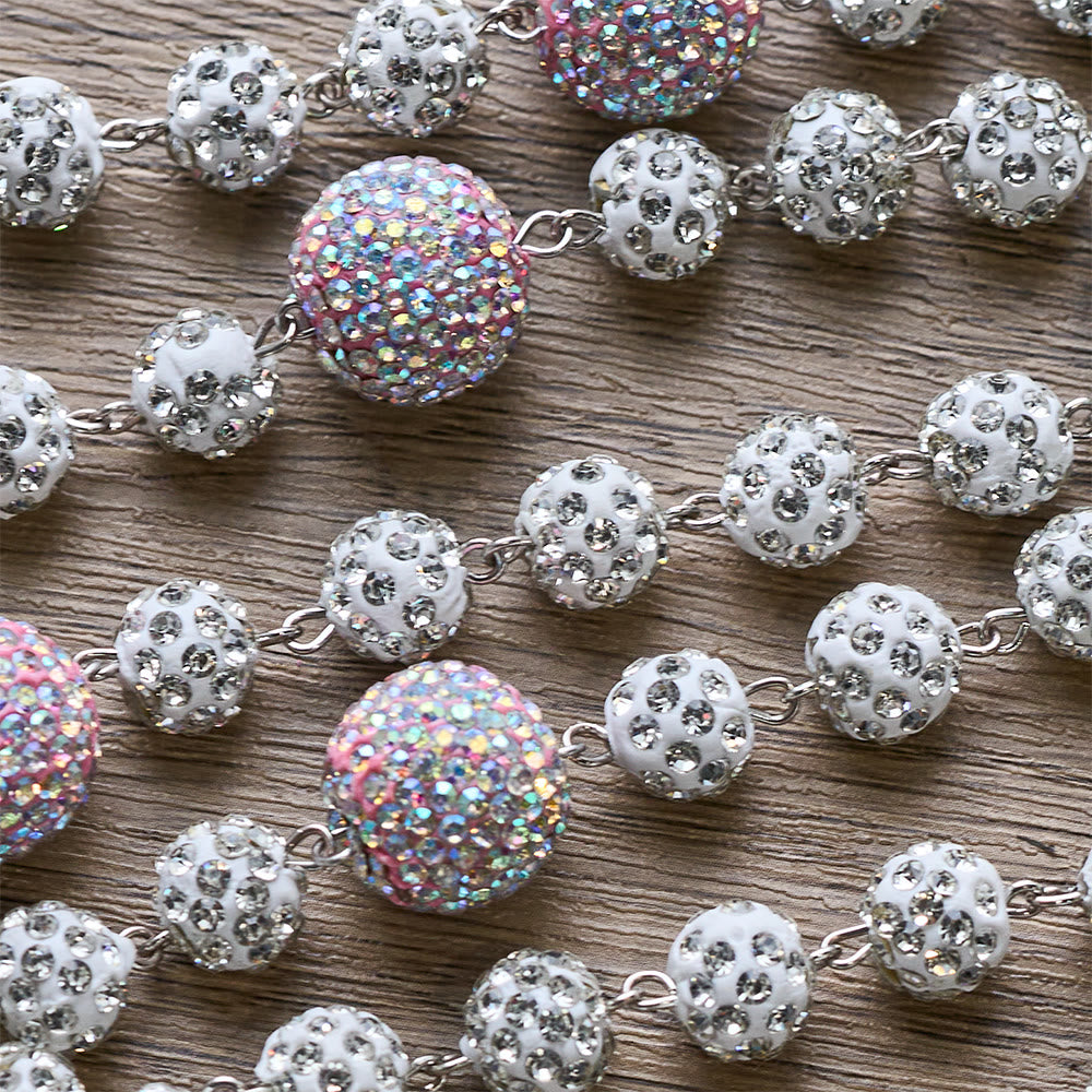 This rosary merges shimmering, embellished beads with Our Lady medal and a crucifix — pairing luminous style with the quiet depth of faith to craft a wearable companion for prayer.