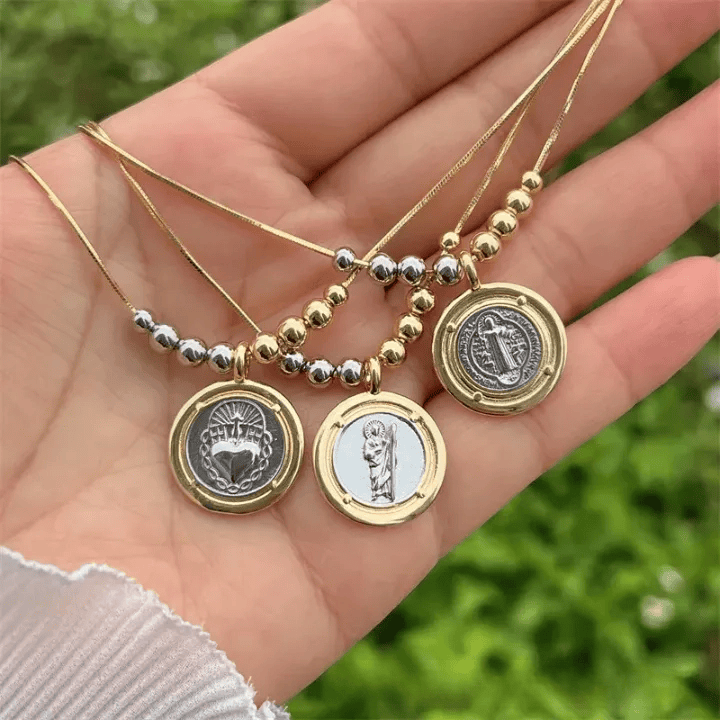 This pendant necklace (featuring Sacred Heart, St. Jude, and St. Benedict in dual tones) merges sacred motifs with delicate beaded chains — pairing meaningful symbolism with gentle style to craft a wearable reminder of His love and their intercession. -
