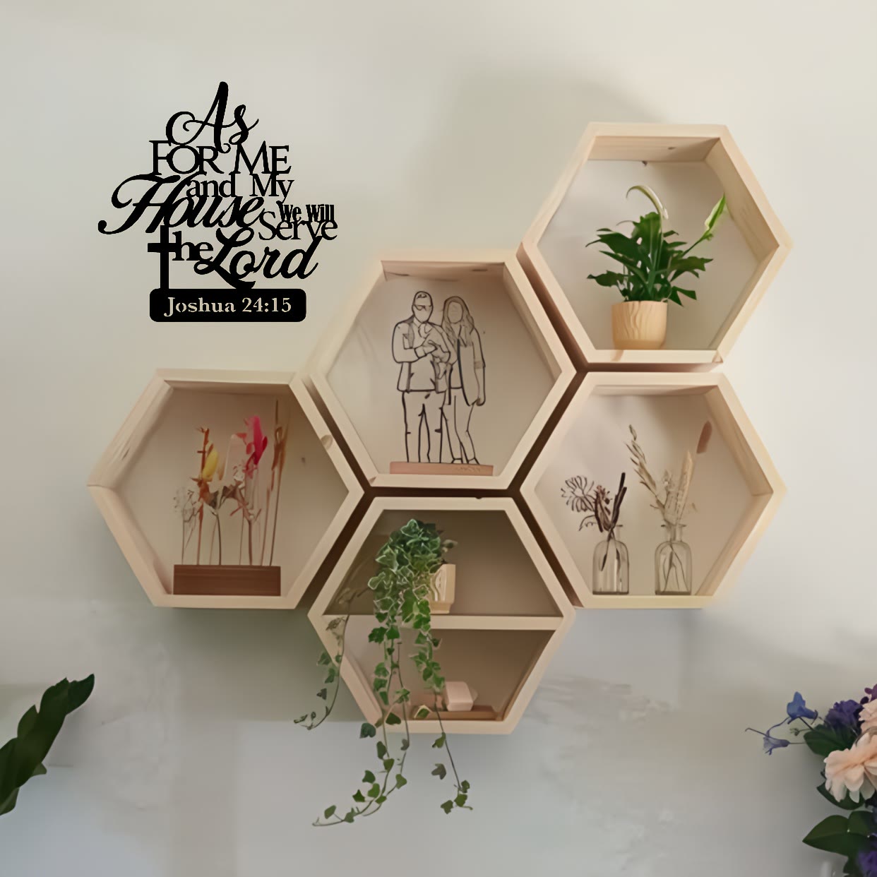 The flowing “As for me and my house, we will serve the Lord” (Joshua 24:15) declares a household promise. The cross base symbolizes Christ as our foundation, while the layered letterforms gather the family under one confession of faith and obedience.