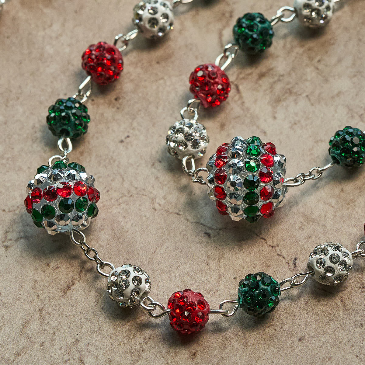 Tricolor beads dazzle beneath shimmering crystals, flowing to a glittering Miraculous Medal—where deep devotion meets celestial brilliance. -