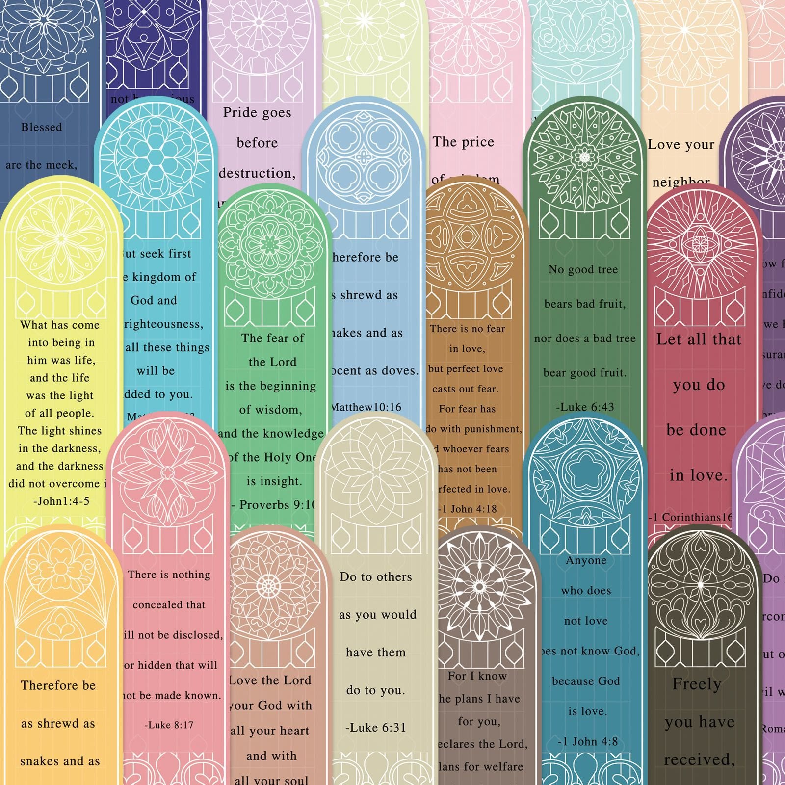 Adorned with intricate stained-glass motifs and printed with carefully selected Bible verses, the 30-piece collection ensures no repetition. The array of colors—ranging from calming blues to joyful yellows—mirrors the diversity of God’s creation, while the verses speak eternal truths. -