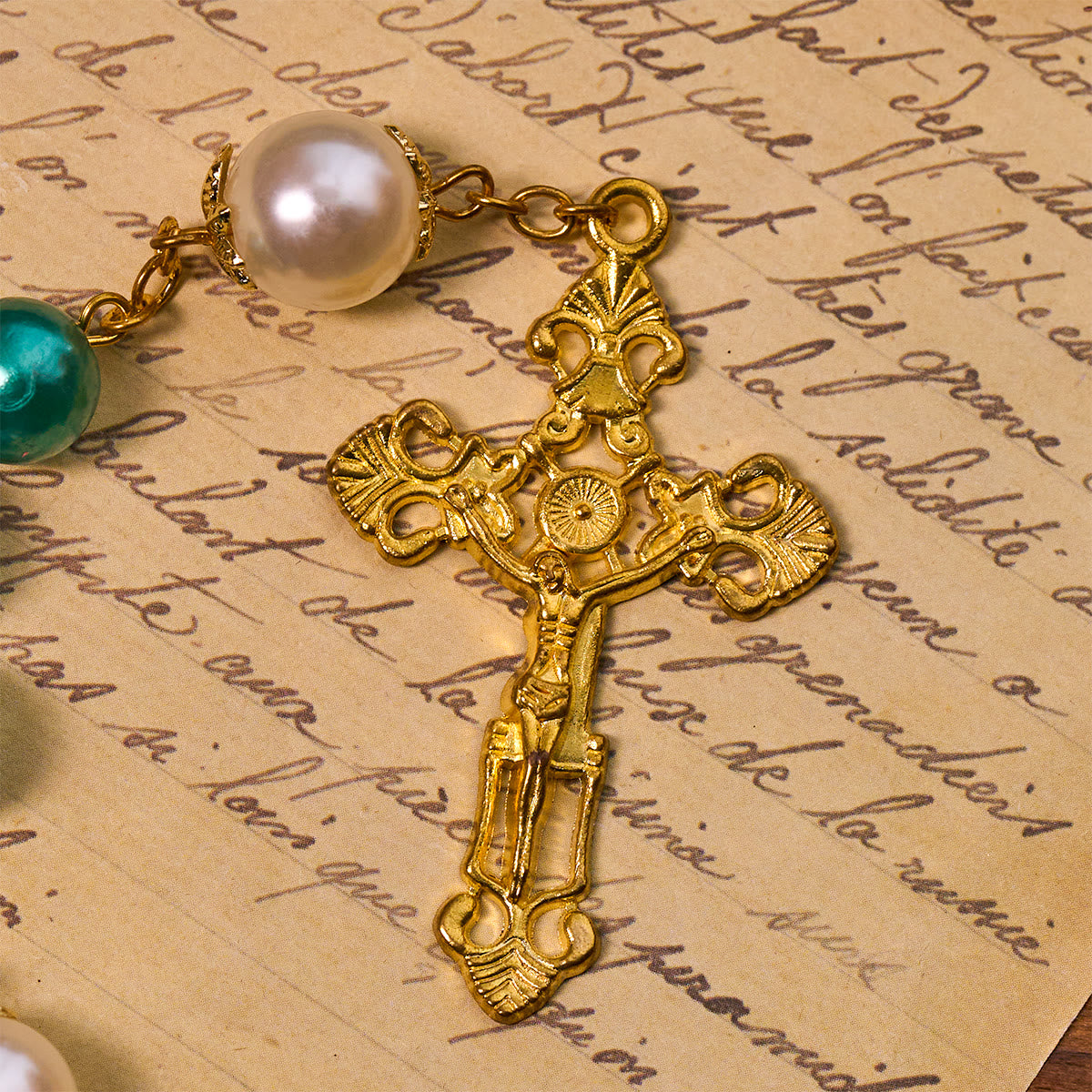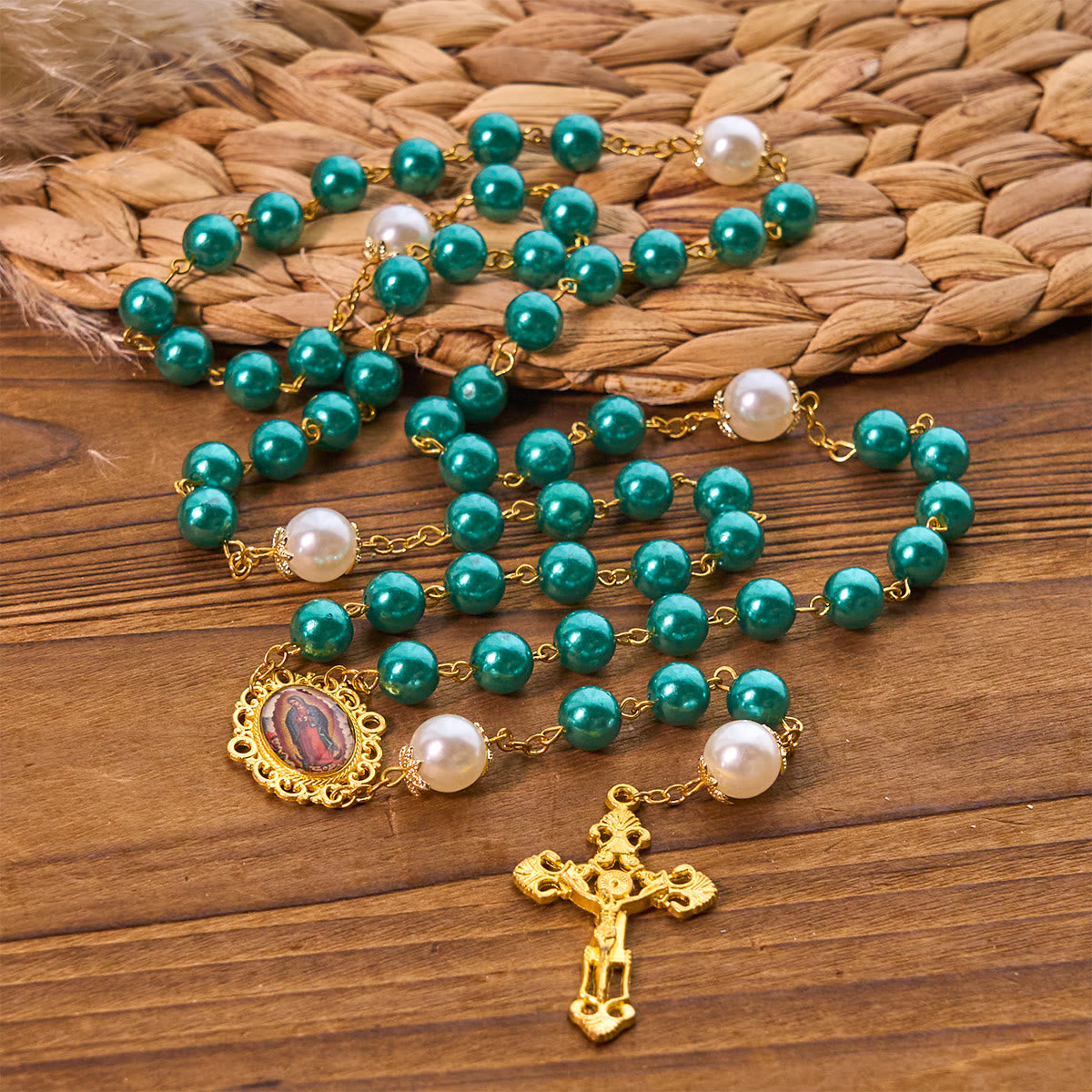 Adorned with glossy teal beads, lustrous pearls, and intricately crafted golden elements (including the crucifix and Miraculous medal), each component blends artistry with reverence. The rich teal, lustrous beads, and warm gold tones create a harmonious, sacred visual charm. -