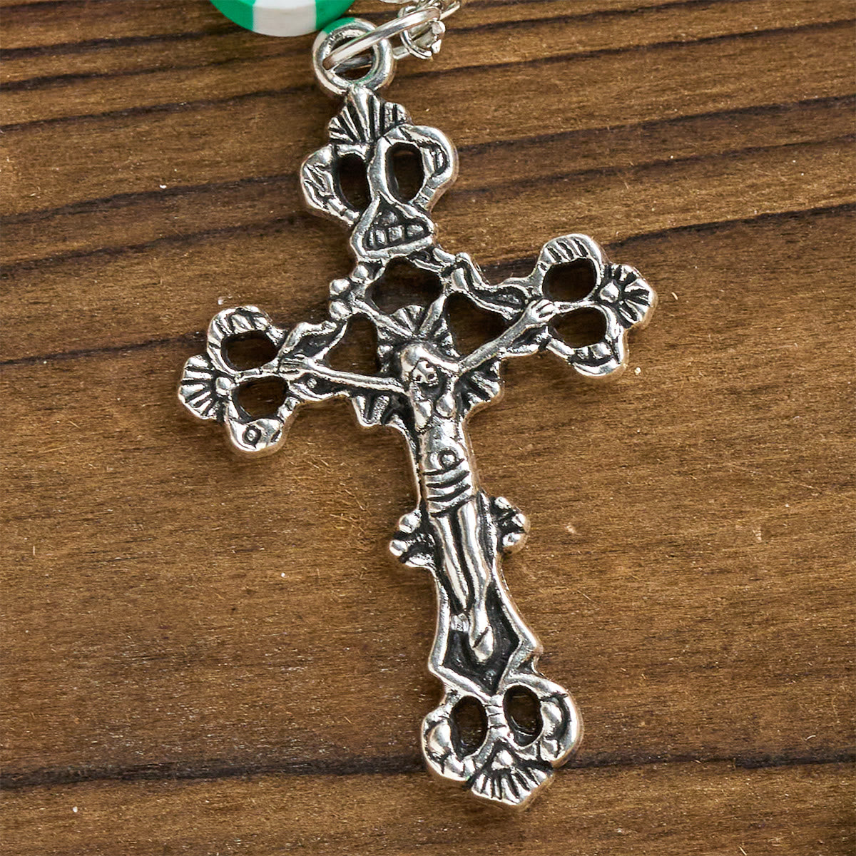 Adorned with colorful candy - styled beads (in red, green, and peppermint patterns), an intricately crafted silver crucifix, and religious medal elements, each component blends Christmas’ joyful warmth with reverent spirituality. -