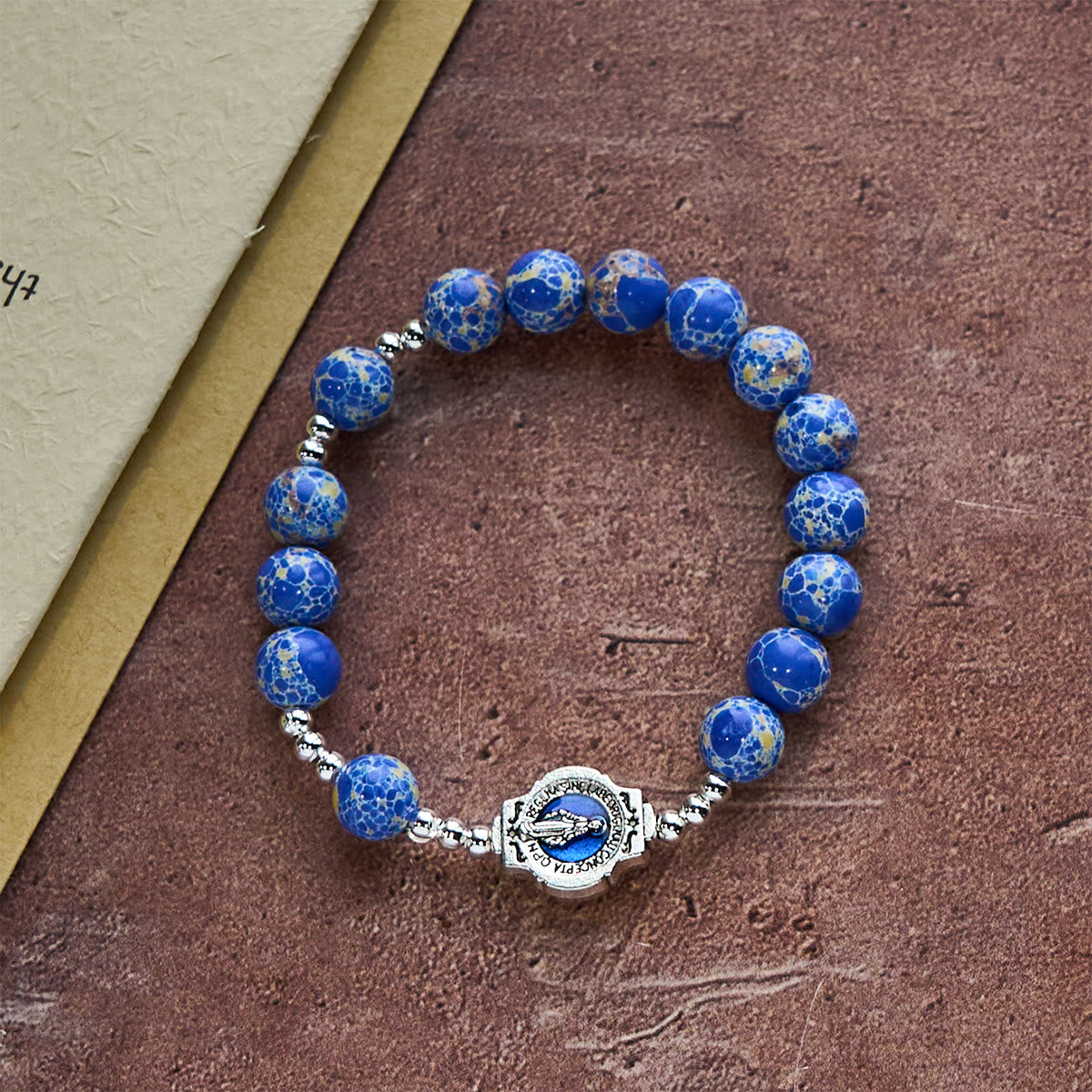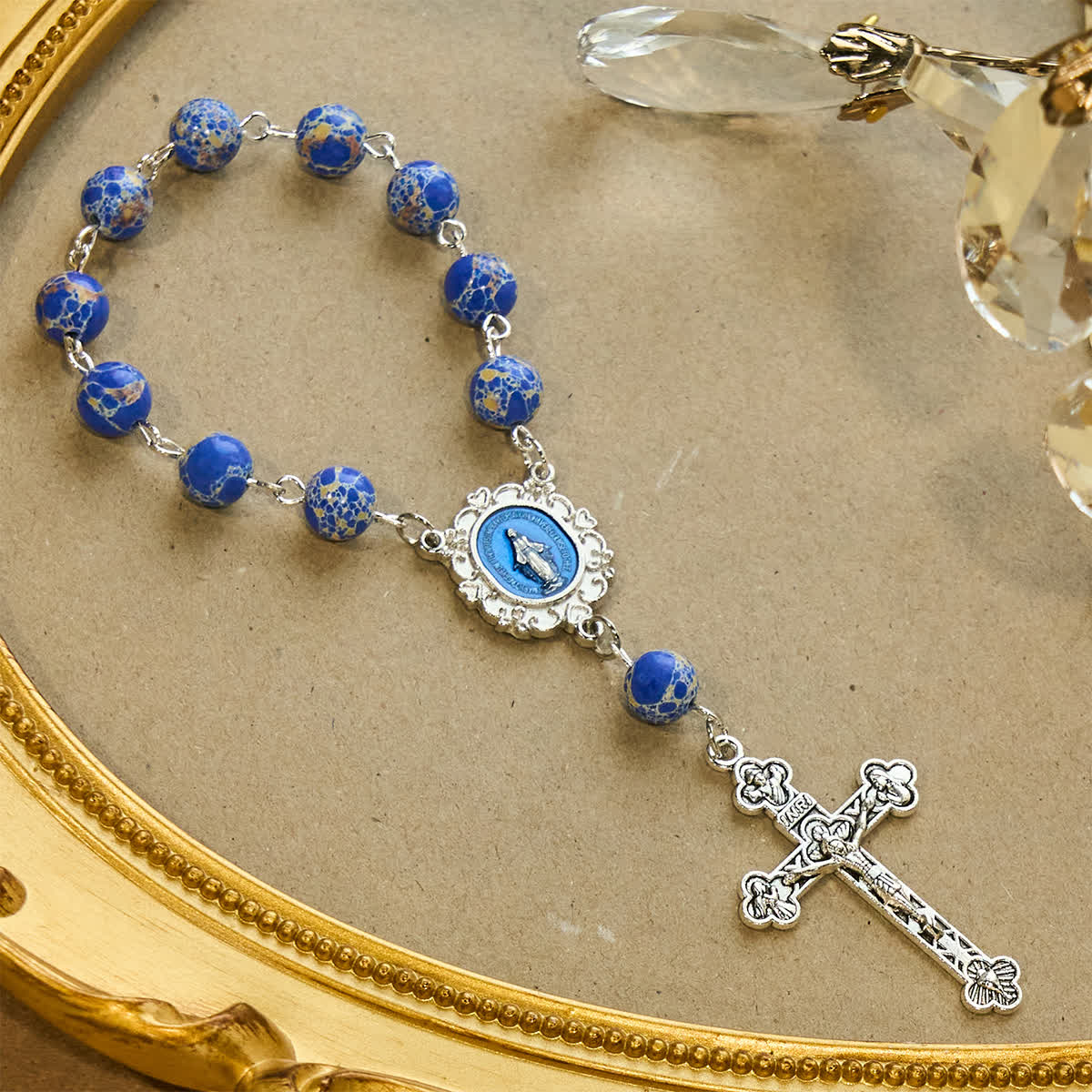 Each blue imperial jasper–tone bead reflects heavenly calm and enduring faith—its natural marbled pattern a reminder that grace flows even through life’s imperfections. The Miraculous Medal, bearing Our Lady of Grace, shines at the rosary’s heart, symbolizing Mary’s tender intercession and the miracles that follow trust in her care. -