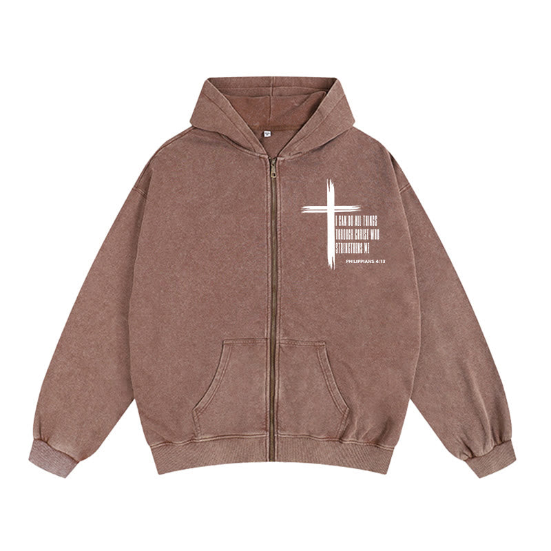 This “Scripture Cross” Hooded Jacket merges biblical inspiration with everyday comfort—featuring a cross graphic paired with the Philippians 4:13 verse “I can do all things through Christ who strengthens me”, embodying spiritual encouragement and faith-driven resilience. Made from soft, washed fabric for all-day wear, it’s ideal for expressing faith in daily life, at gatherings, or while relaxing.