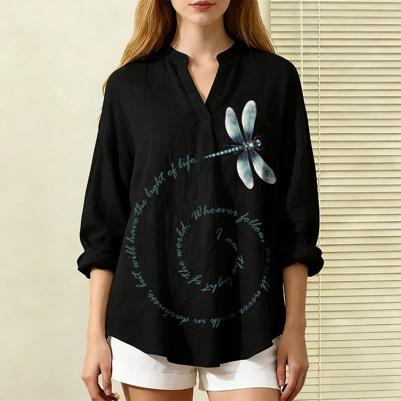 Walk in the light with style and grace. This airy cotton-blend blouse features a delicate dragonfly print and the uplifting verse from John 8:12: “Whoever follows me will never walk in darkness, but will have the light of life.” Soft, flowy, and designed for everyday wear—let your faith shine through your look.