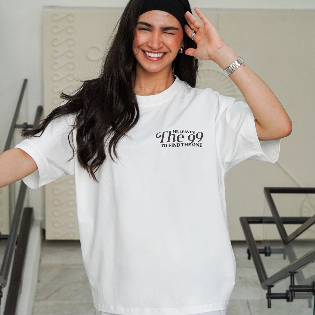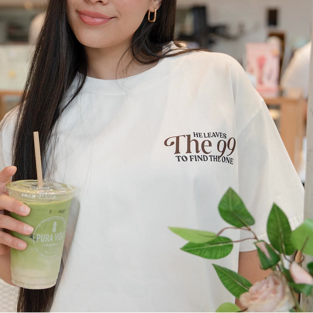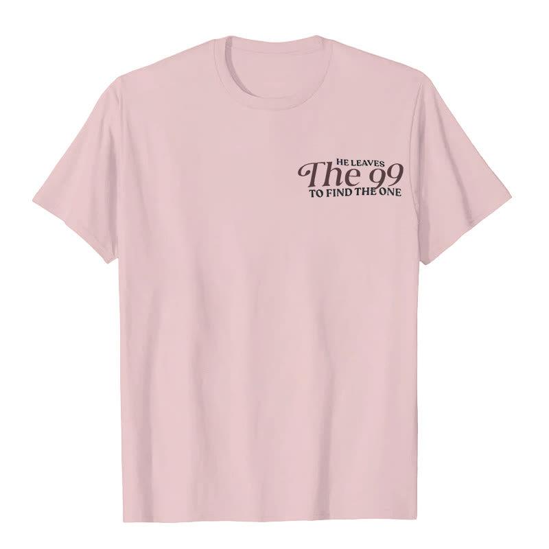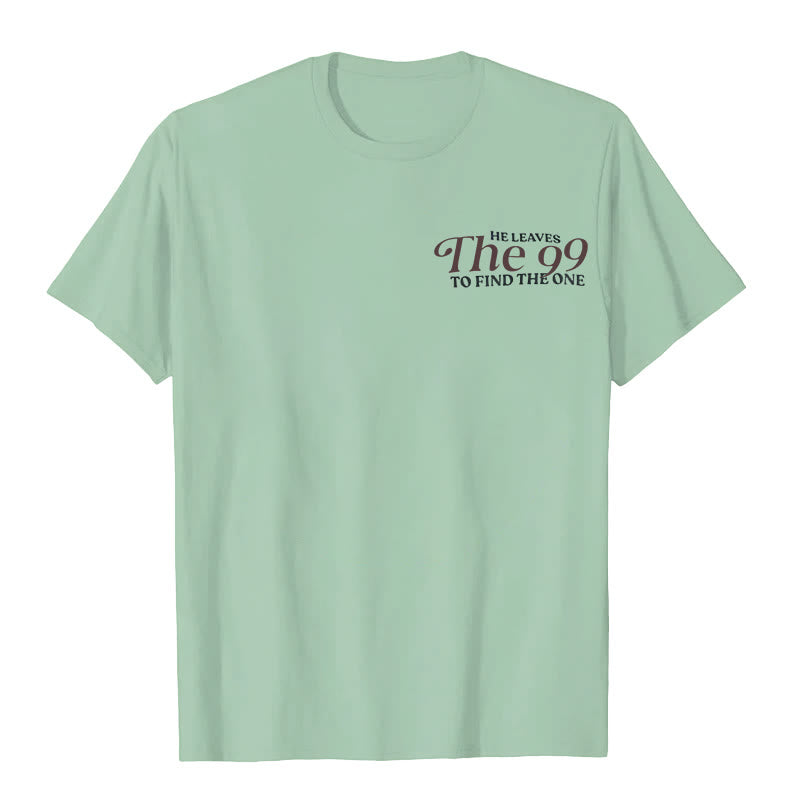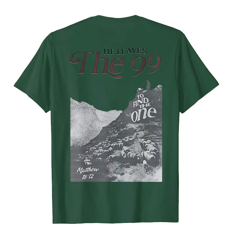 The back of this T-shirt is designed with ingenuity, with the words "HE LEAVES The 99 TO FIND THE one" eye-catching, and the black and white pattern of a person standing on the top of the mountain, vividly reproducing the classic scene of the shepherd looking for sheep in Matthew 18:12, and deeply interpreting God's persistent salvation and endless care for every individual.