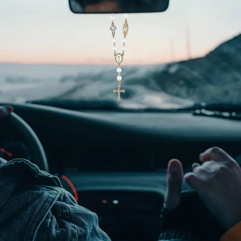 Crafted from polished metal with luminous white beads and sparkling zircon details, this necklace preserves the sacred weight of the rosary and its timeless beauty. Built to endure, it maintains a reverent, elegant look for years. -