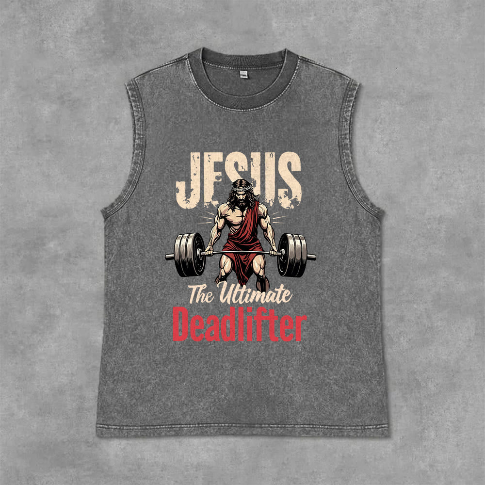Introducing the "Jesus The Ultimate Deadlifter" Unisex Washed Tank Top, a bold and empowering piece that speaks volumes about your faith and physical strength. Crafted from premium, breathable, and durable washed fabric, this black sleeveless tank top is designed for maximum mobility during workouts, weightlifting sessions, and casual activewear.
