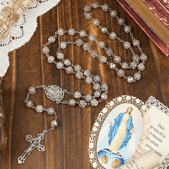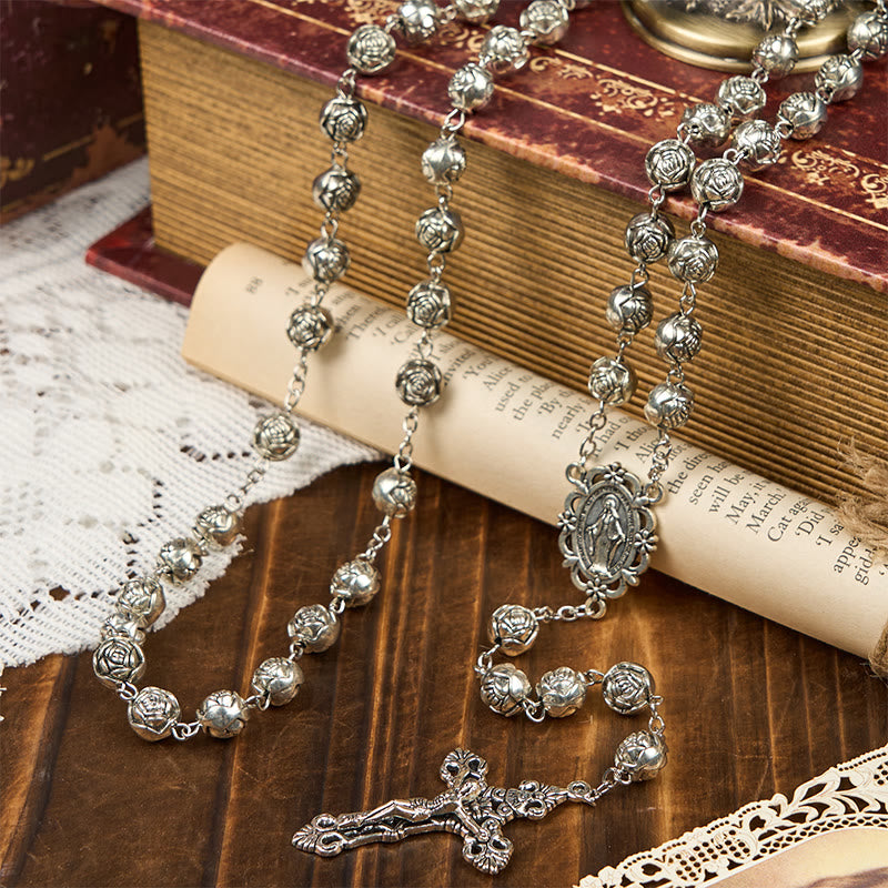 Each bead is elegantly designed with intricate floral patterns, exuding a sense of grace and beauty. These finely detailed beads are linked together with a durable silver-tone chain, ensuring that the rosary can withstand frequent use while maintaining its stunning appearance.