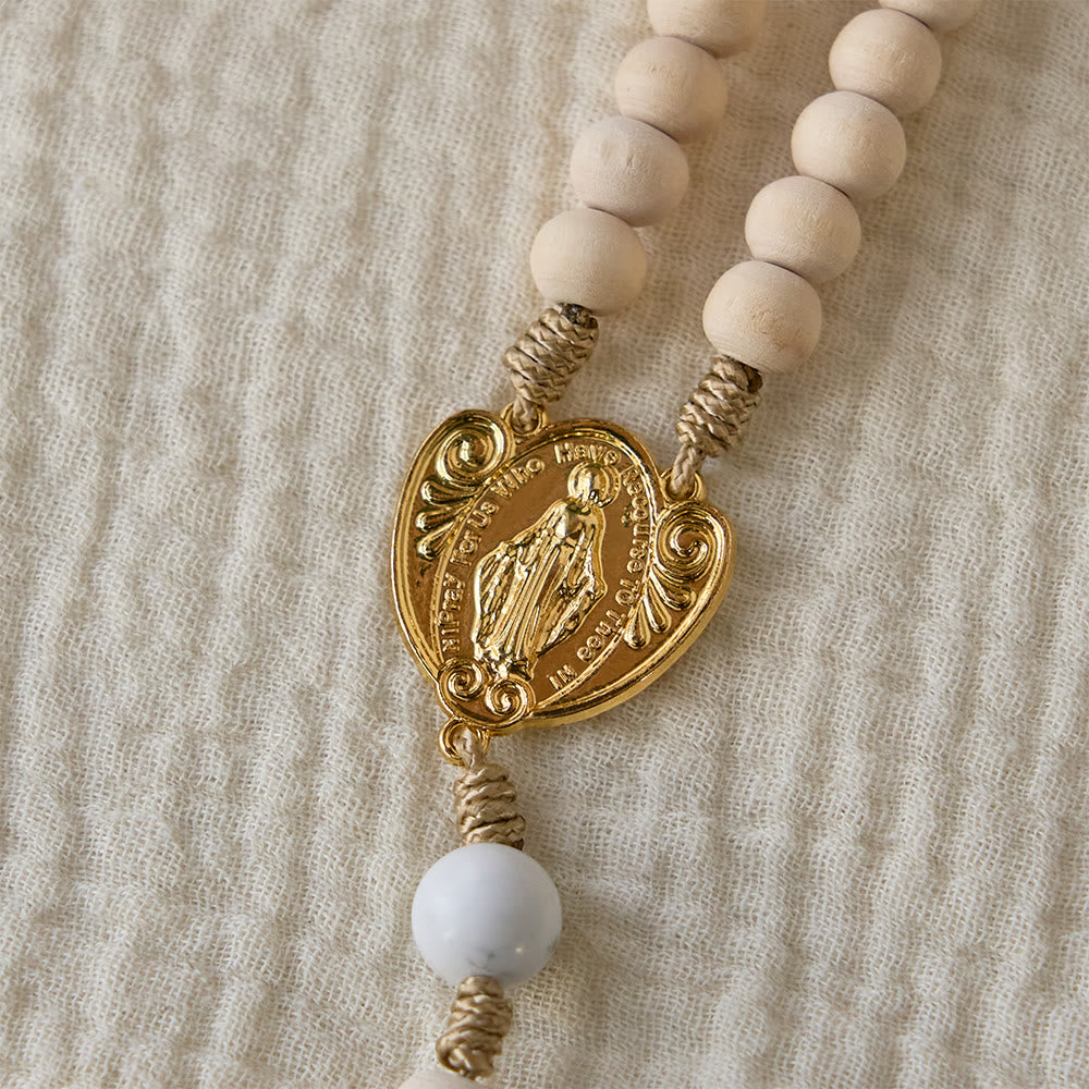 This rosary embodies the grounded peace of faith and maternal love of Our Lady—crafted with smooth wooden beads, white turquoise accent beads, an ornate gold Our Lady medallion, and a detailed gold crucifix. The warm wood evokes the humility of Christ’s earthly life, while the white turquoise symbolizes divine peace, turning every prayer into a heartfelt act of devotion to Christ and Our Lady. -