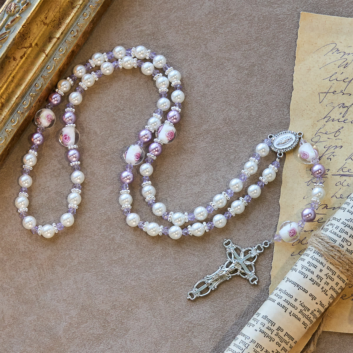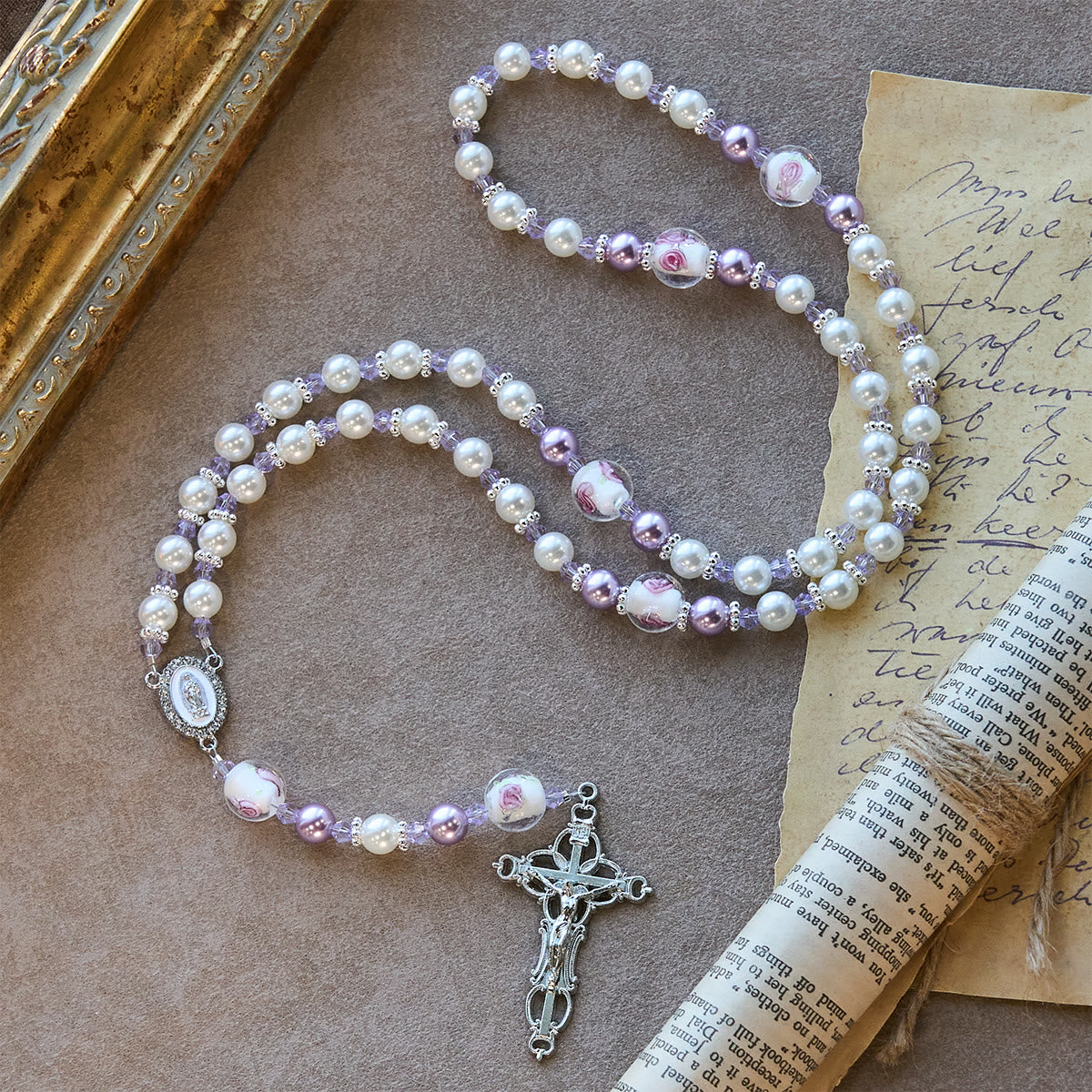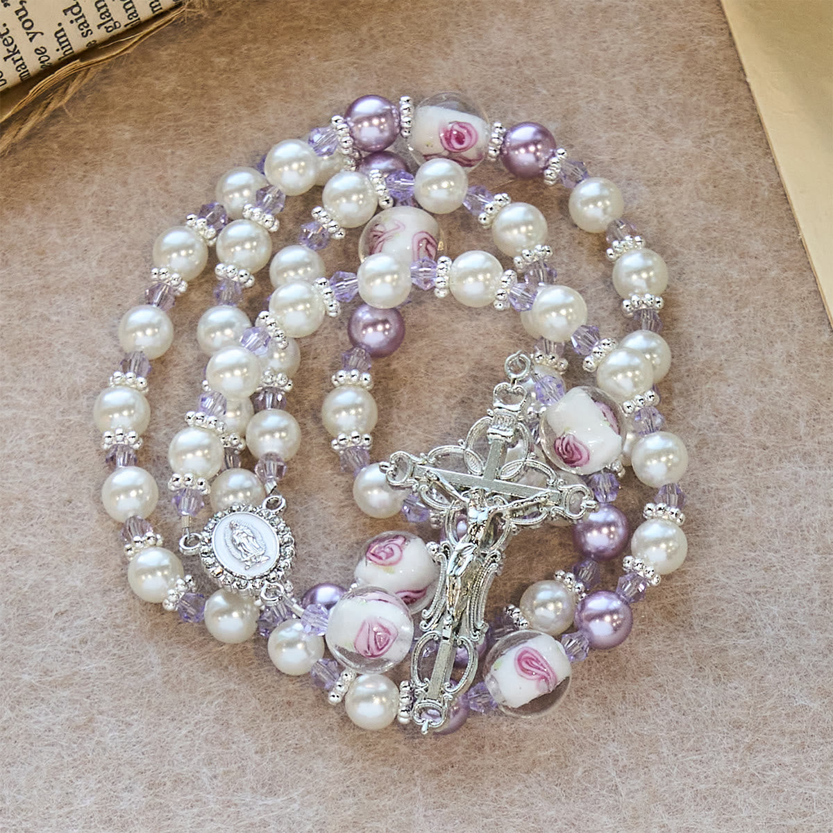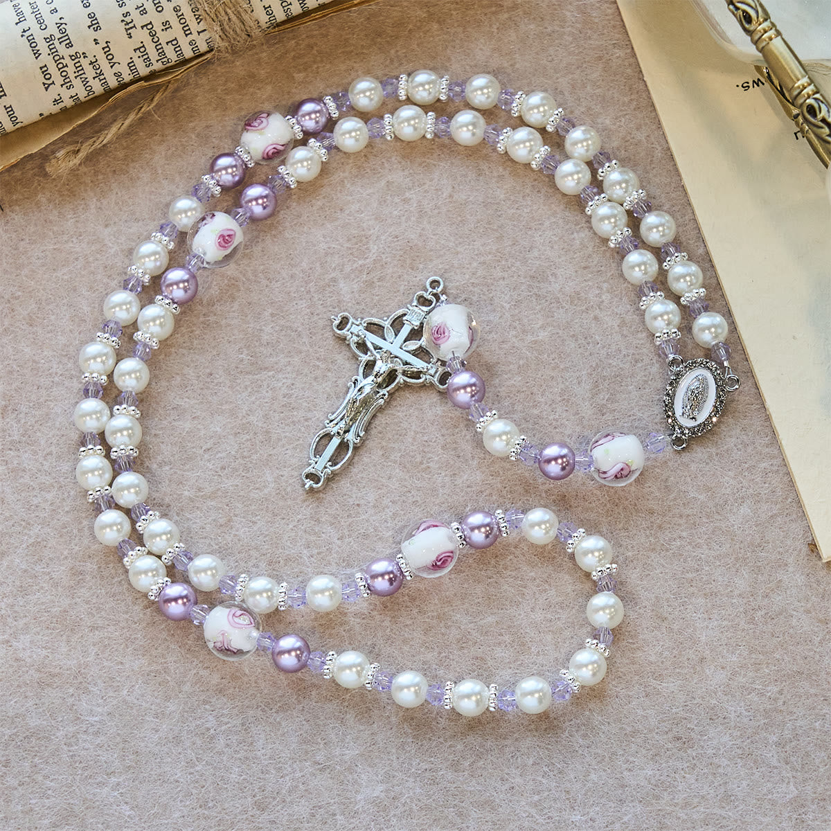Each bead blends pearl-like smoothness with subtle floral details, paired with soft tonal accents. Hand-assembled and matched to the detailed sacred charms, it honors your faith journey—merging delicate beauty and divine meaning.