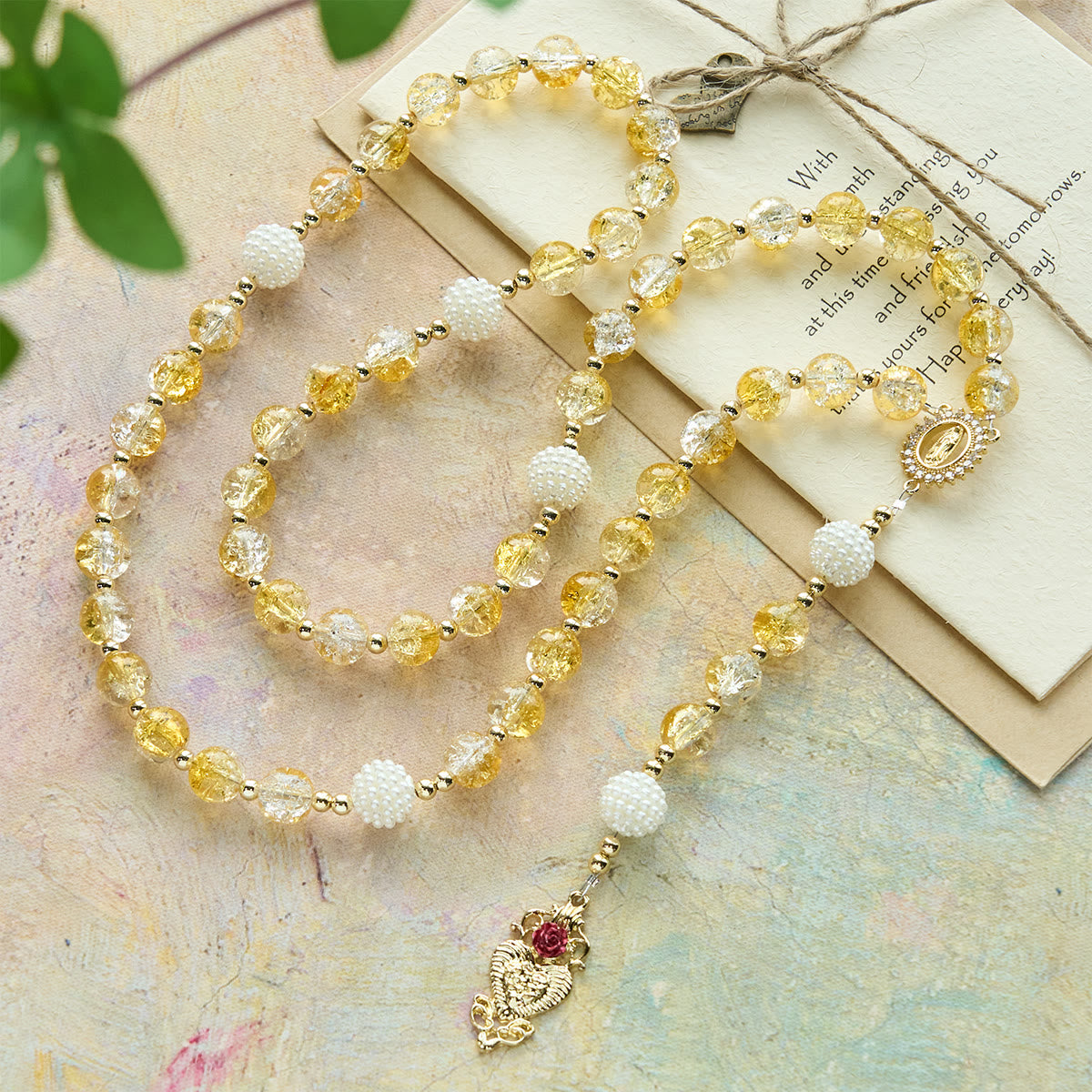The golden-hued glass beads, like droplets of faith, flow toward the Our Lady of Guadalupe center and sacred heart pendant, anchoring each prayer in divine reverence. It merges glass elegance with sacred symbolism, celebrating the beauty of spiritual devotion.