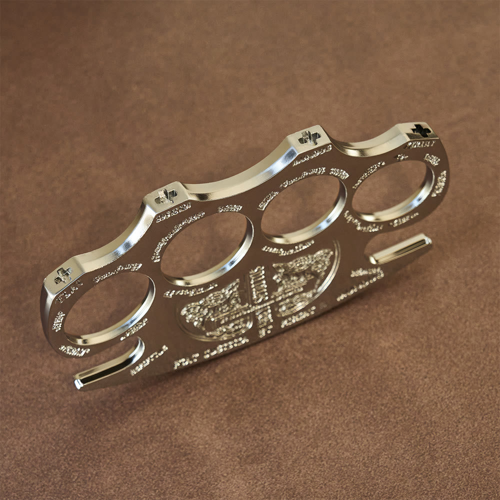 Precisely shaped from solid metal, the piece features a layered cross motif, engraved scripture-inspired lettering, and integrated openings that reflect strength, order, and intention. -
