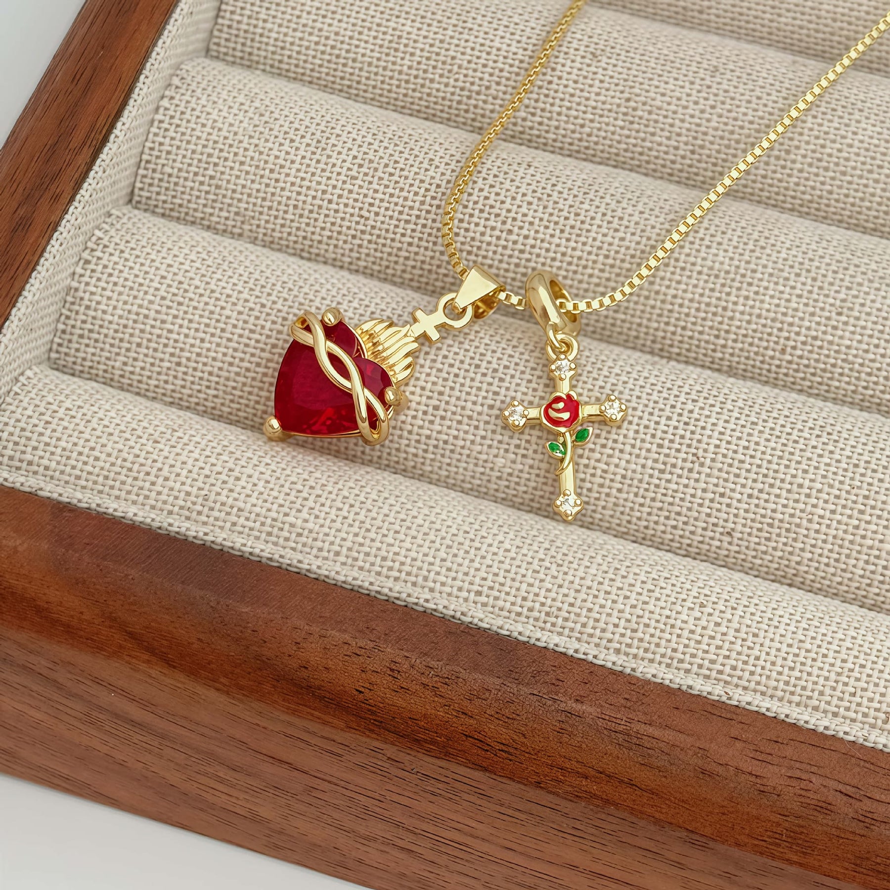A delicate gold-toned necklace features two interchangeable pendants: a vivid Sacred Heart with golden crown of thorns and wings, and a cross adorned with a red rose and sparkling stones. This elegant piece anchors faith in a visible declaration of divine love, sacrifice, and the tender grace of the Sacred Heart.