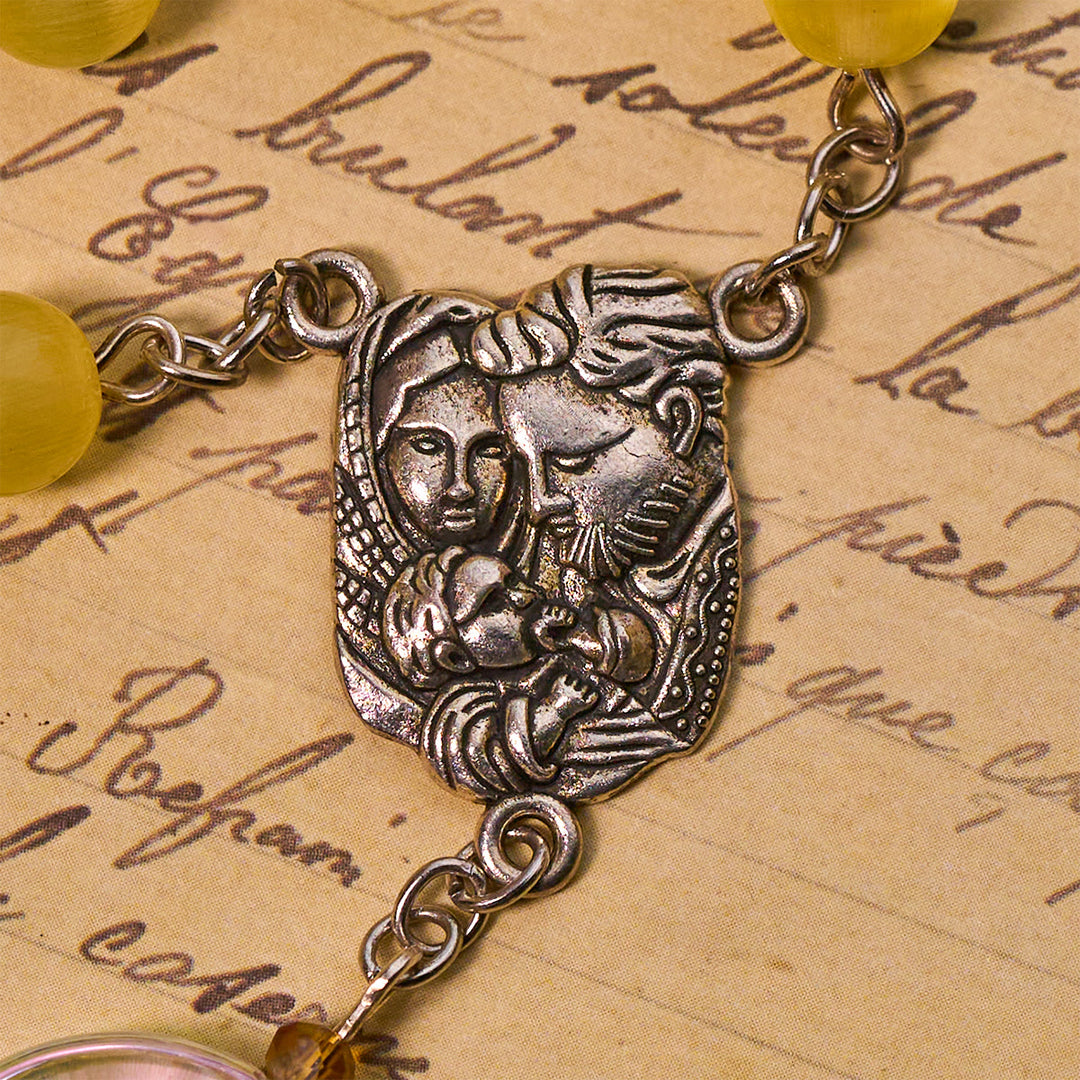 This rosary shines with warm yellow beads symbolizing light, hope, and resurrection. The oversized aurora beads refract rainbow hues, creating a sacred aura that reflects the mystery of God’s glory in prayer. -